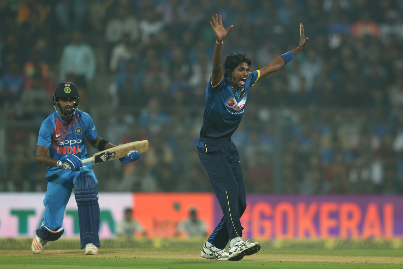 മറുപടി ബാറ്റിങ്ങിനിറങ്ങിയ ഇന്ത്യൻ നിരയിൽ നാലാം ഒാവറിൽ ഒാപണർ ലോകേഷ് രാഹുൽ(4) പെട്ടന്ന് പുറത്തായി. ദുഷ്മന്തമ ചമീരയെറിഞ്ഞ പന്തിൽ രാഹുൽ എൽബിയിൽ കുരുങ്ങുകയായിരുന്നു. പിന്നാലെ രോഹിത് ശർമ കൂറ്റനടി തുടങ്ങിയെങ്കിലും നീണ്ടു നിന്നില്ല. ദാസുൻ ഷാനകയുടെ പന്ത് സിക്സറിന് പറത്താനുള്ള ശ്രമം കുശാൽ പെരേരയുടെ കൈയിലൊതുങ്ങി. ശ്രേയസ് അയ്യുറും(30) മനീഷ് പാണ്ഡ്യയും(32) പിന്നാലെ ഹാർദിക് പാണ്ഡ്യയും(4) പുറത്തായതോടെ ഇന്ത്യ പ്രതിരോധത്തിലായി. എന്നാൽ, ധോണിയും(16), ദിനേഷ് കാർത്തികും(18) ചേർന്ന് വിജയിപ്പിക്കുകയായിരുന്നു.
