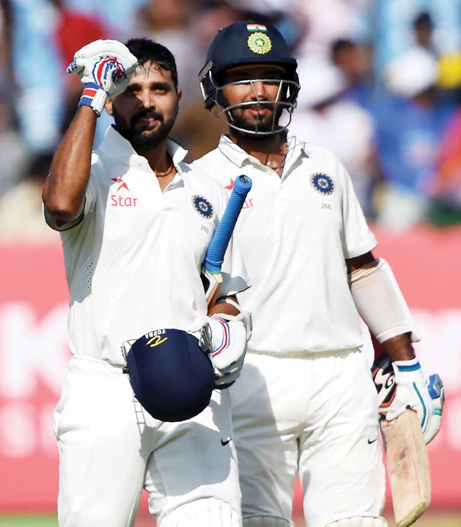 കളിപഠിച്ച സൗരാഷ്ട്ര ക്രിക്കറ്റ് അസോസിയേഷന് മൈതാനത്ത് സുന്ദരമായി ബാറ്റുവീശി 206 പന്തുകളില് 17 ബൗണ്ടറികളുടെ അകമ്പടിയോടെ 124 റണ്സ് നേടിയ പൂജാര, ബെന് സ്റ്റോക്കിന്െറ പന്തില് കുക്കിന് പിടികൊടുത്ത് മടങ്ങുമ്പോള് ഇന്ത്യന് സ്കോര് 277. പകരമത്തെിയ കോഹ്ലി വിജയിന് പിന്തുണനല്കി. കോഹ്ലിക്കൊപ്പം കൂട്ടുചേര്ന്ന് നേടിയ 41 റണ്സ് കൂട്ടിച്ചേര്ത്ത് സ്കോര് 300 കടത്തിയാണ് വിജയ് ക്രീസ് വിട്ടത്. 301 പന്തുകളില് 126 റണ്സെടുത്ത വിജയിന്െറ ബാറ്റില്നിന്ന് നാലു സിക്സറുകളും ഒമ്പത് ബൗണ്ടറികളും പിറന്നു. രണ്ടാം ദിവസത്തെ കളി അവസാനഘട്ടത്തിലേക്ക് കടക്കവെ, ഫോര്വേര്ഡ് ഷോര്ട്ട്ലെഗ്ഗില് ഹസീബ് ഹമീദിന്െറ കൈകളില് സുരക്ഷിതമായത്തെിച്ച് ലെഗ് സ്പിന്നര് ആദില് റാഷിദ് വിജയിനെ മടക്കിയപ്പോള് സ്കോര് 318. മൂന്നാം ദിവസം കളി അവസാനിക്കാന് മിനിറ്റുകള്മാത്രം ശേഷിക്കെ രാത്രികാവല്ക്കാരനായി എത്തിയത് അമിത് മിശ്ര. എന്നാല് മിശ്ര (പൂജ്യം) വന്നതും പോയതും ഒരുമിച്ചായിരുന്നു. സഫര് അന്സാരിയുടെ പന്തില് ഹസീബ് ഹമീദിന് പിടികൊടുത്തു. ഇംഗ്ളണ്ടിനുവേണ്ടി സ്റ്റുവാര്ട്ട് ബ്രോഡ്, സഫര് അന്സാരി, ആദില് റാഷിദ്, ബെന് സ്റ്റോക്ക് എന്നിവര് വിക്കറ്റുകള് നേടി.