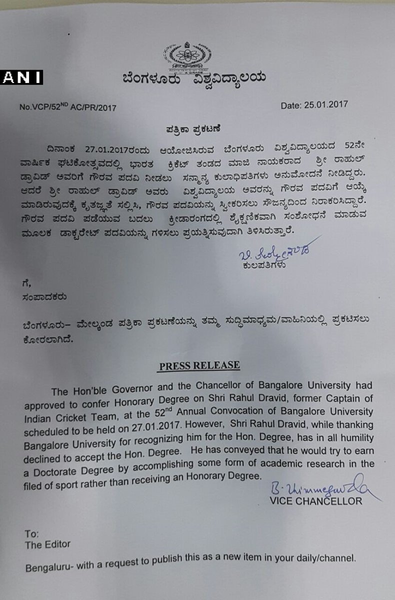 ബംഗളൂരു സർവകലാശാലയാണ് ഇക്കാര്യം മാധ്യമങ്ങളെ അറിയിച്ചത്. ഇന്ത്യയുടെ വൻമതിൽ എന്നറിയപ്പെടുന്ന ക്രിക്കറ്റ് താരമാണ് രാഹുൽ ദ്രാവിഡ്. ദീഘകാലം ഇന്ത്യയുടെ ക്യാപ്റ്റനുമായിരുന്നു. നിലവിൽ ഇന്ത്യയുടെ അണ്ടർ–19 ടീമിെൻറ പരിശീലകനാണ് രാഹുൽ ദ്രാവിഡ്.