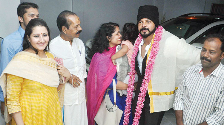 കൊച്ചി നെടുമ്പാശ്ശേരി വിമാനത്താവളത്തിൽ ശ്രീശാന്തിനെ സ്വീകരിക്കുന്ന ഭാര്യ ഭുവനേശ്വരി, അച്ഛൻ ശാന്തകുമാരാൻ നായർ, സഹോദരി എന്നിവർ