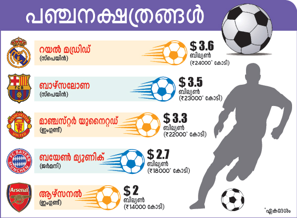 റയലിന്െറ ചിരവൈരികളായ ബാഴ്സലോണ രണ്ടാമതും ഇംഗ്ളീഷ് ക്ളബ് മാഞ്ചസ്റ്റര് യുനൈറ്റഡ് മൂന്നാമതുമാണ്. 12 ശതമാനം മൂല്യം കൂടിയ ബാഴ്സക്ക് 350 കോടി ഡോളറാണ് മൂല്യം. ഏകദേശം 23000 കോടി രൂപ വരും. മാഞ്ചസ്റ്ററിന് 330 കോടി ഡോളറിന്െറ മൂല്യമുണ്ട്. ഏകദേശം 22000 കോടി രൂപക്ക് തുല്യമായ തുകയാണിത്. ബയേണ് മ്യൂണിക്കിന് 270 കോടി ഡോളറും അഞ്ചാമതുള്ള ആഴ്സനലിന് 200 കോടി ഡോളറും മൂല്യമുണ്ട്. മാഞ്ചസ്റ്റര് സിറ്റി, ചെല്സി, ലിവര്പൂള്, യുവന്റസ്, ടോട്ടന്ഹാം എന്നിവരാണ് ആദ്യ പത്തിലുള്ള മറ്റ് ക്ളബുകള്.