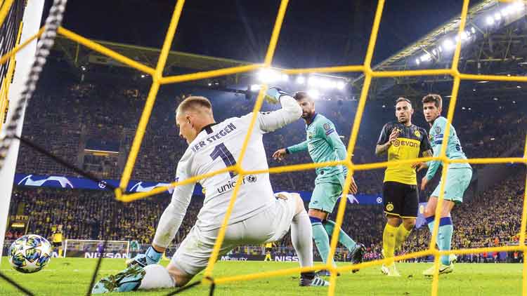 പരിക്കിൽനിന്ന് മുക്തനായി സാക്ഷാൽ ലയണൽ മെസ്സി കളത്തിലിറങ്ങിയ രാവിൽ ഡോർട്മുണ്ടിലെ ബി.വി.ബി സ്റ്റേഡിയത്തിൽ ഗോളി ടെർ സ്റ്റീഗനായിരുന്നു ബാഴ്സലോണയുടെ ഹീറോ. സീസണിൽ ആദ്യമത്സരത്തിനിറങ്ങിയ മെസ്സിക്കൊപ്പം മുന്നണിയിൽ അപാര പ്രഹരശേഷിയുള്ള അേൻറാണിയോ ഗ്രീസ്മാനെയും ലൂയി സുവാറസിനെയും ഇടംവലം നിർത്തിയിട്ടും ഡോർട്മുണ്ടിെൻറ കോട്ടകൊത്തളങ്ങൾ തകർത്തുകയറാൻ കാറ്റേലാണിയൻ കരുത്തർക്ക് കഴിഞ്ഞില്ല. 59ാം മിനിറ്റിൽ മെസ്സി പകരക്കാരനായെത്തുംവരെ പുൽത്തകിടിയിലുണ്ടായിരുന്ന കൗമാര താരോദയം അൻസു ഫാറ്റിക്കും ജർമൻ ക്ലബിനെ വിറപ്പിക്കാനായില്ല.