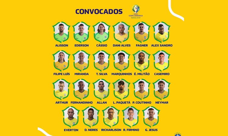 ടീം ബ്രസീൽ: ഗോൾ കീപ്പർ: അലിസൺ (ലിവർപൂൾ), എഡേഴ്സൺ (മാഞ്ചസ്റ്റർ സിറ്റി), കാസിയോ (കൊറിന്ത്യൻസ്).