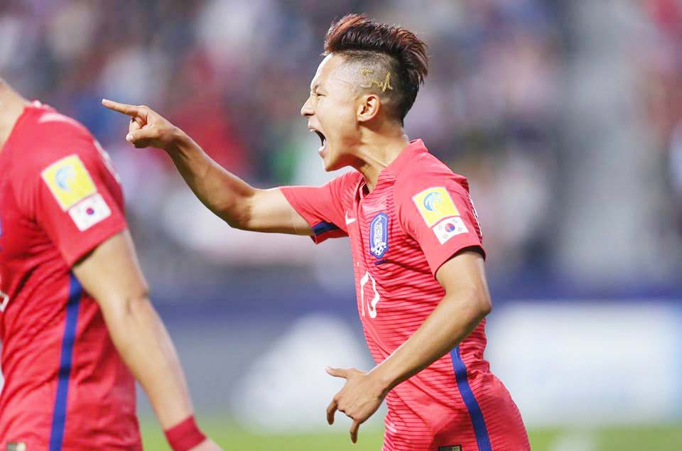 കൊറിയയുടെ ആദ്യ ഗോൾ നേടിയ ബാഴ്സലോണ യൂത്ത് താരം ലീ സ്യൂങ് വൂവിെൻറ ആഹ്ലാദം