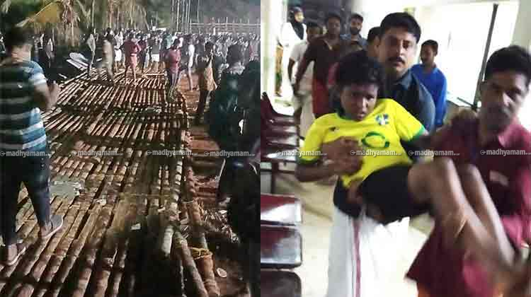 മുളകൾ കൊണ്ട് പണിത കിഴക്കേ ഗ്യാലറിയിലേക്ക് ആളുകൾ കയറുമ്പോൾ തന്നെ ഇളക്കം അനുഭവപ്പെട്ടിരുന്നതായി പരിക്കേറ്റ ചിലർ പറഞ്ഞു. ഇതിനിടെ ഗ്യാലറിക്ക് ബലം നൽകാൻ വിളക്കുകാലിനോട് ചേർന്ന് കെട്ടിയ കയർ വെളിച്ചം ക്രമീകരിക്കുന്നതിന്റെ ഭാഗമായി അഴിച്ചതാണ് വീഴാൻ കാരണമായതെന്ന് മക്കളോടൊപ്പം ഗ്യാലറിയിലുണ്ടായിരുന്ന വ്യക്തി പറഞ്ഞു. ഇദ്ദേഹത്തിന്റെ കൂടെയുള്ള കുട്ടിക്കും പരിക്കുണ്ട്.