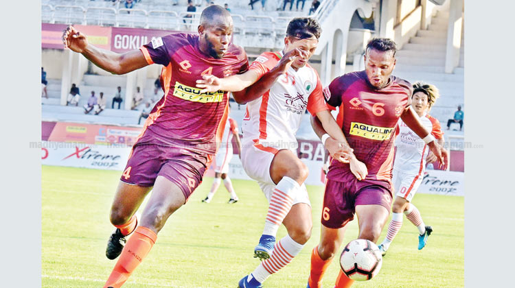 നെരോകയുടെ ചെഞ്ചോ ഗെൽഷെൻറ മുന്നേറ്റം തടയുന്ന ഗോകുലത്തിെൻറ ആന്ദ്രെ എറ്റിയന്നെയും മുഹമ്മദ് ഇർഷാദും