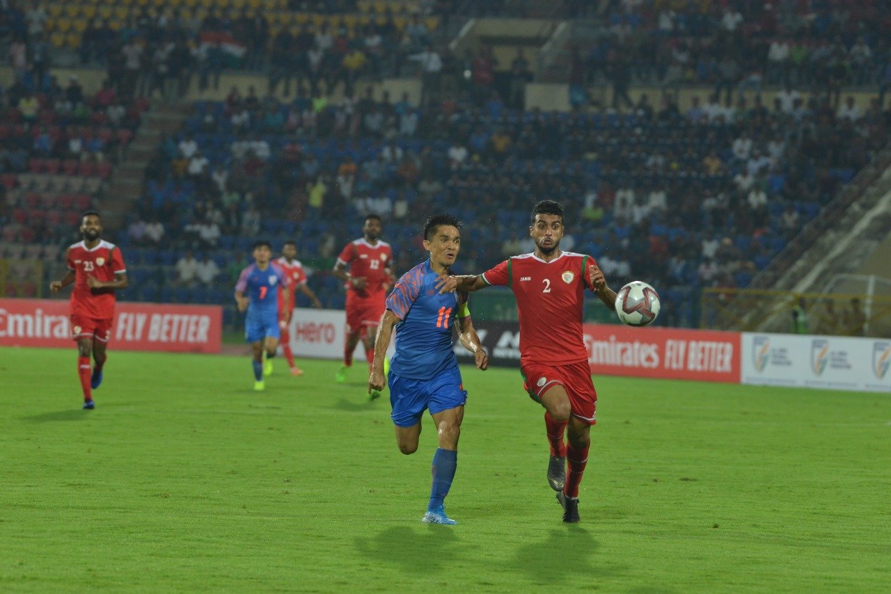 ഗുവാഹതി സ്റ്റേഡിയത്തിലെ ആരവങ്ങൾ കനപ്പിച്ച് ആതിഥേയ ഗോളിന് വഴിയൊരുങ്ങിയതും ആഷിക്കിലൂടെയായിരുന്നു. ഇടതു വിങ്ങിൽ ആഷിക്കിനെ വീഴ്ത്തിയതിന് ലഭിച്ച ഫ്രീകിക്ക് തൊടുത്തത് ബ്രാൻഡൺ ഫെർണാണ്ടസ്. ബോക്സിനുള്ളിൽ മാർക്ക് ചെയ്യപ്പെടാതെ നിന്ന ഛേത്രിക്ക് നിലംപറ്റെതട്ടിനീക്കിയ പന്തിൽ ഇന്ത്യൻ ക്യാപ്റ്റൻ തൊടുത്ത ഫസ്റ്റ്ടൈം ഷോട്ട് ഒമാൻ പ്രതിരോധവിടവിനിടയിലൂടെ വലക്കുള്ളിലേക്ക് പാഞ്ഞു കയറി. ഇന്ത്യ പതിയെ പ്രതിരോധത്തിലേക്ക് ഉൾവലിഞ്ഞപ്പോൾ പന്തിന്മേൽ വ്യക്തമായ മേധാവിത്വം പുലർത്തിയ ഒമാൻ ആതിഥേയരെ ആശങ്കയിലാഴ്ത്തി. അഹ്മദ് കാനോയുടെ പോയൻറ് ബ്ലാങ്ക് ഹെഡർ അടക്കം തട്ടിയകറ്റിയ ഗോളി ഗുർപ്രീതിെൻറ മിടുക്കിൽ ലീഡ് വഴങ്ങാതെ നിന്ന പിടിച്ചുനിന്ന ഇന്ത്യ ഇടവേളക്ക് പിരിയുേമ്പാൾ വിജയ പ്രതീക്ഷയിലായിരുന്നു.