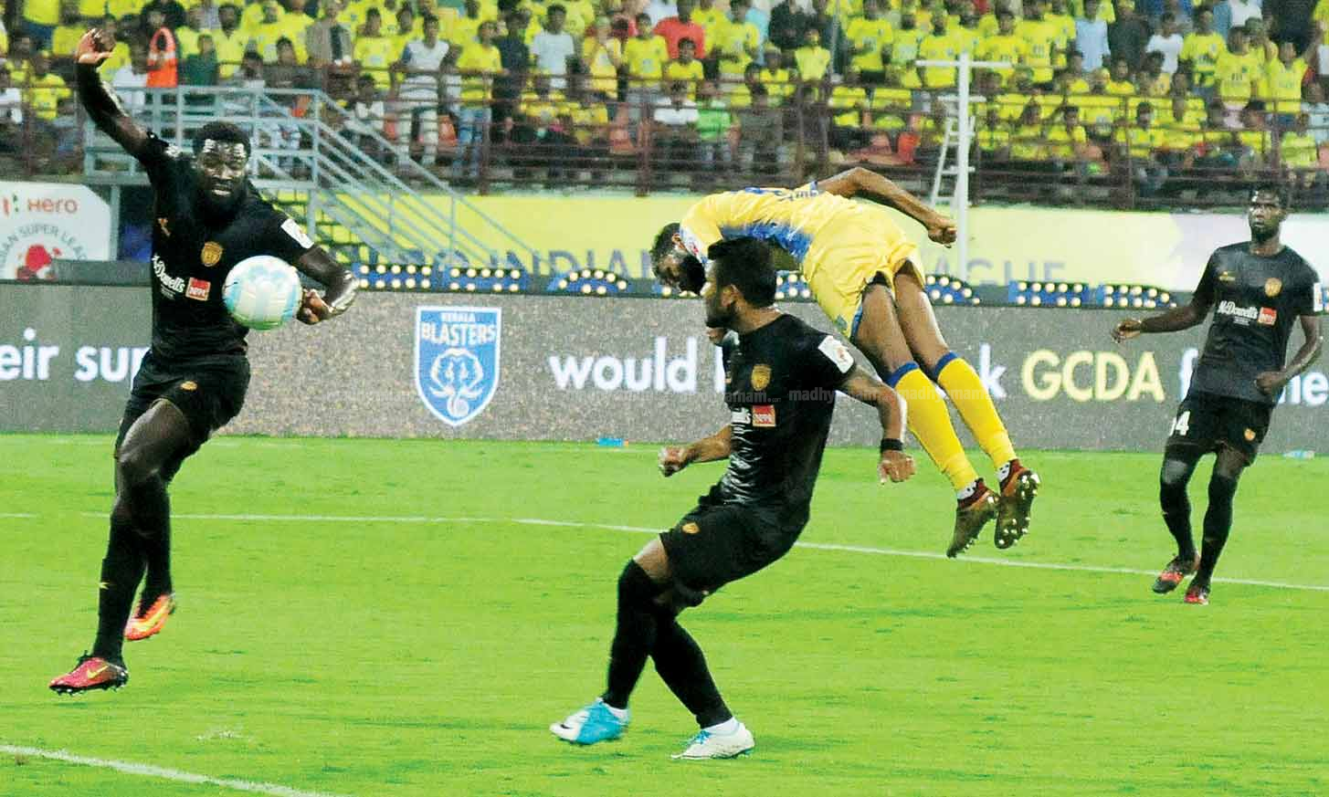 നാലാം മിനിറ്റിൽ തന്നെ അവർ ശ്രദ്ധേയ നീക്കം നടത്തി. എന്നാൽ, 24ാം മിനിറ്റിൽ നോർത്ത് ഈസ്റ്റിനെ ഞെട്ടിച്ച് ബ്ലാസ്റ്റേഴ്സിെൻറ ഗോൾ പിറന്നു. ജിങ്കാൻ തുടങ്ങിവെച്ച നീക്കത്തിനൊടുവിൽ പന്തുമായി റിനോ ആേൻറായുടെ മുന്നേറ്റം. വലതുവിങ്ങിലേക്ക് കുതിച്ചുകയറി ബോക്സിലേക്ക് നൽകിയ ക്രോസിൽ മാർക്ക് ചെയ്യാതെ നിന്നിരുന്ന വിനീതിെൻറ മികച്ചൊരു ഹെഡർ നോർത്ത് ഈസ്റ്റ് ഗോളി രഹ്നേഷിനെ മറികടന്ന് വലയിലേക്ക്. സന്ദർശകർ ഞെട്ടിത്തരിച്ച നിമിഷം ഗാലറിയിൽ ആഘോഷനൃത്തം. ലീഡ് നേടിയതോടെ ഉണർന്ന കൊമ്പന്മാർ നിരന്തരം ആക്രമണങ്ങളുമായി നോർത്ത് ഈസ്റ്റിനെ പരീക്ഷിച്ചു. 42ാം മിനിറ്റിൽ ബ്ലാസ്റ്റേഴ്സിന് വീണ്ടുമൊരു സുവർണാവസരം. നോർത്ത് ഈസ്റ്റ് പ്രതിരോധത്തെ സമർഥമായി മറികടന്ന് സിഫ്നിയോസ് ബോക്സിലേക്ക്. പക്ഷേ, ബോക്സിനു തൊട്ടുമുന്നിൽവെച്ച് സിഫ്നിയോസിനെ രഹ്നേഷ് കാലിൽപിടിച്ച് നിലത്തിടുന്നു. ഗോൾ തടുക്കാനുള്ള ശ്രമം നോർത്ത് ഈസ്റ്റിന് സമ്മാനിച്ചത് ചുവപ്പുകാർഡ്. ഹോളി ചരൺ നർസാരിയെ മാറ്റി രഹ്നേഷിനു പകരം രവികുമാറെത്തി.