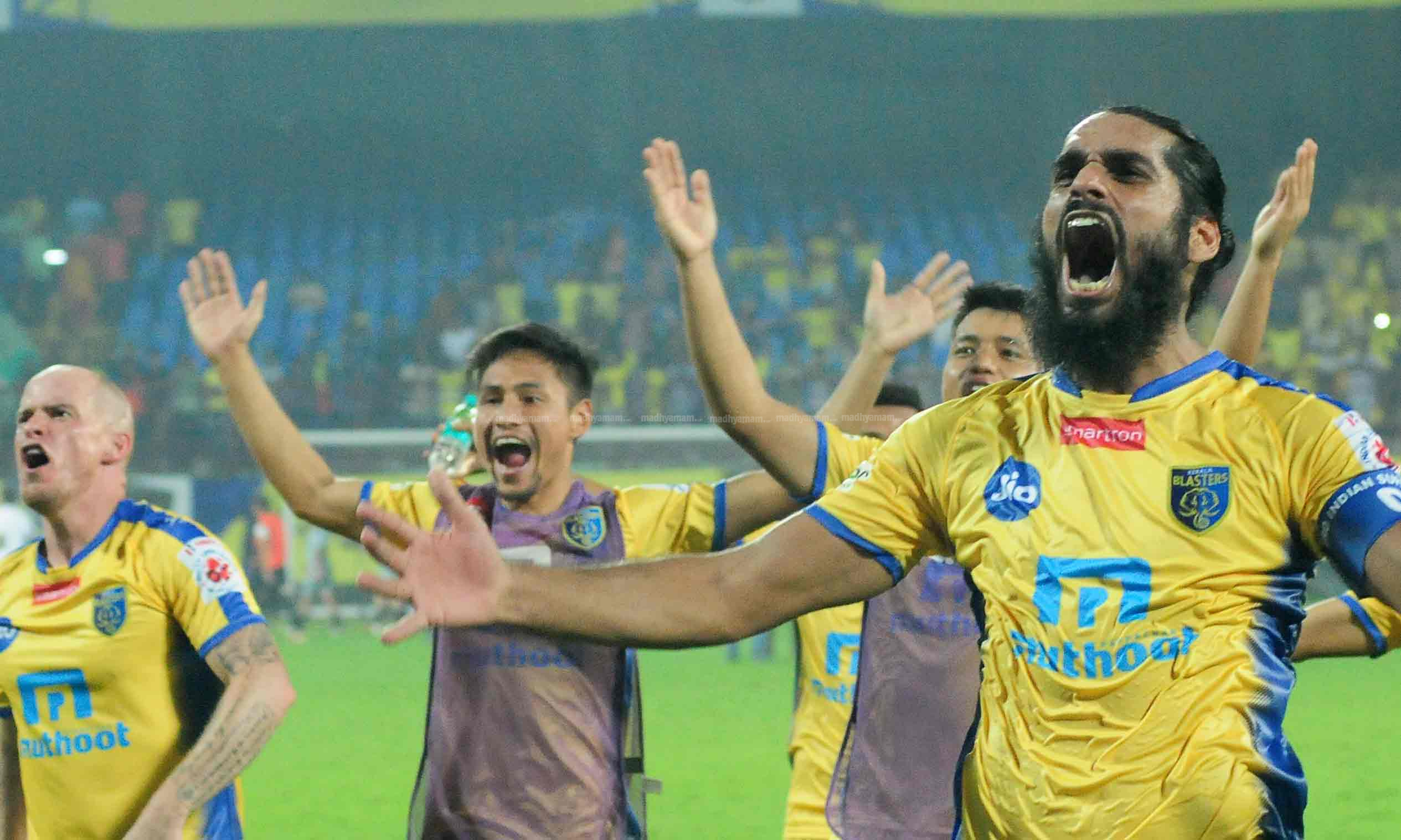നോർത്ത് ഇൗസ്റ്റ് യുനൈറ്റഡിെനതിരെ കേരള ബ്ലാസ്റ്റേഴ്സിെൻറ വിജയ ഗോൾ നേടുന്ന സി.കെ. വിനീത് -ദിലീപ് പുരയ്ക്കൽ