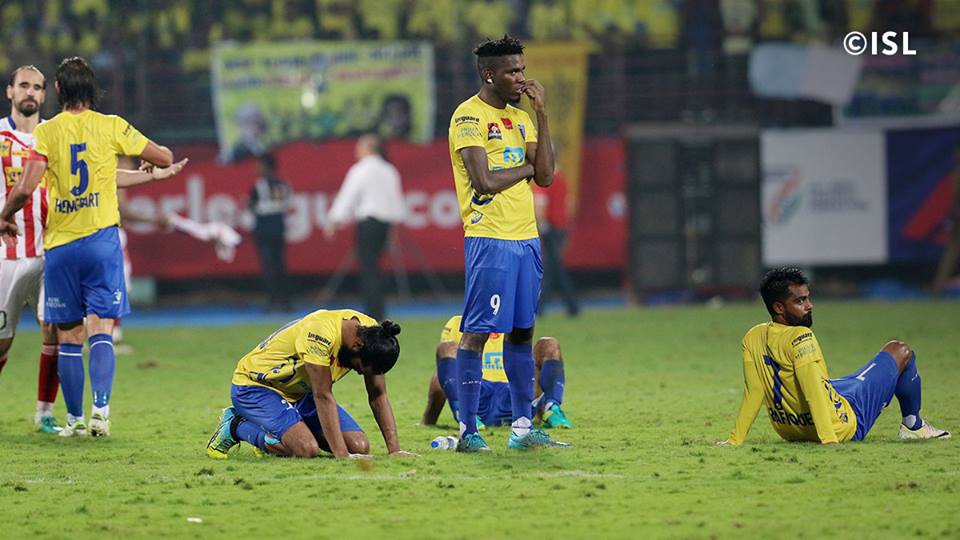 ആദ്യം കിക്കെടുത്ത അന്റോണിയോ ജെര്മെന് ഗോള് ലക്ഷ്യത്തിലെത്തിച്ചു. രണ്ടാം കിക്കെടുത്ത കൊല്ക്കത്തയുടെ ഇയാന് ഹ്യൂമിന്റെ കിക്ക് ബ്ലാസ്റ്റേഴ്സ് ഗോളി തടുത്തു. ബ്ലാസ്റ്റേഴ്സിന്റെ രണ്ടാം കിക്കെടുത്ത ബെല്ഫോര്ട്ടും പന്ത് കൃത്യമായി വലയിലെത്തിച്ചു. കൊല്ക്കത്തക്കായി സൗമിക് ഡ്യൂട്ടിയും ലക്ഷ്യത്തിലെത്തിച്ചു. പിന്നീട് കിക്കെടുത്ത ബ്ലാസ്റ്റേഴ്സ് താരം എെേന്റയുടെ കിക്ക് ഗോള് പോസ്റ്റിന് പുറത്തെക്ക് ആയിരുന്നു. പിന്നീട് ബോര്ഗ ഫെര്ണാണ്ടസ് കൊല്ക്കത്തക്കായി ലക്ഷ്യം കണ്ടു. മുഹമ്മദ് റഫീഖ് പിന്നീട് കേരളത്തിനായി വലകുലുക്കി. ഇതോടെ സ്കോര് 3-2 എന്ന നിലയിലായി. പിന്നീട് കിക്കെടുത്ത യാവി ലാറ ബ്ലാസ്റ്റേഴ്സ് വല കുലുക്കി (3-3). കിക്കെടുത്ത കേരളത്തിന്റെ വല്യേട്ടന് എന്ന് വിളിക്കുന്ന സെട്രിക്് ഹെന്ബേര്ട്ടിന്റെ ഷോട്ട് ഗോളി ഡെര്ജിത്ത് മജൂംദാര് തടുത്തിട്ടു. കിക്കെടുത്ത കൊല്ക്കത്തന് താരം ജുവല്രാജ കിക്ക് കൃത്യമായി വലയിലെത്തിച്ചതോടെ കേരളത്തിന്റെ തോല്വി ഉറപ്പിച്ചു.