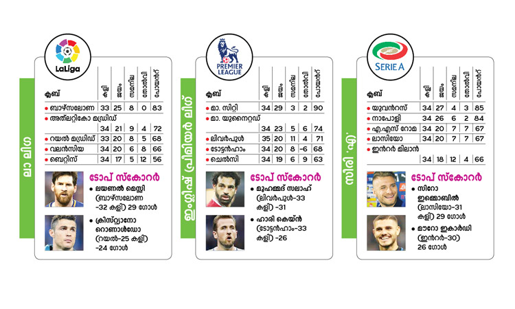 യൂറോപ്പിലെ ‘ബെസ്റ്റ് ഫോർ’ എന്നു വിശേഷിപ്പിക്കുന്ന ലീഗുകളിൽ ഇനിയുള്ളത് ആവേശം നിറയുന്ന ഫൈനൽ ലാപ്പ് അങ്കങ്ങൾ. ഇംഗ്ലണ്ടിലും ജർമനിയിലും കിരീടമുറപ്പിച്ചപ്പോൾ, ഇറ്റലിയിലും സ്പെയിനിലും കളി മുറുകുകയാണ്. കിരീടം തീർപ്പായ ഇടങ്ങളിൽ ആദ്യ നാലു സ്ഥാനക്കാർക്കായി മരണപ്പോരാട്ടങ്ങൾ. മേയ് 21 വരെ നീളുന്ന ഉദ്വേഗങ്ങളിൽ ചോരപൊടിയാതെയും കണ്ണീർ വീഴാതെയും വിജയിക്കാനുള്ള തത്രപ്പാടിലാണ് യൂറോപ്പിെൻറ ക്ലാസ് ടീമുകളും സൂപ്പർതാരങ്ങളും.