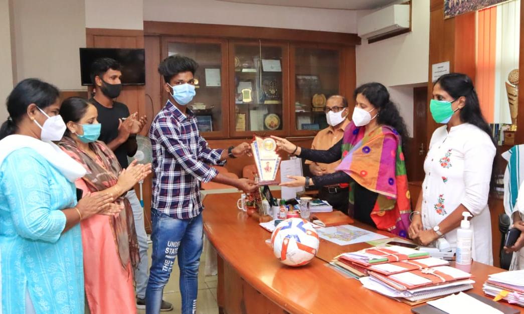 ഫുട്ബാളും മൊമൊന്റെയും കലക്ടര് അപ്പുവിന് സമ്മാനിച്ചു. കലക്ടറേറ്റ് ചേമ്പറില് നടന്ന അനുമോദന ചടങ്ങില് ജില്ല വനിതാ ശിശു വികസന ഓഫിസര് പി. മീര, ചില്ഡ്രന്സ് ഹോം സൂപ്രണ്ട് നിഷ മോള്, വുമണ് പ്രൊട്ടക്ഷന് ഓഫിസര് എസ്. ലേഖ, ജില്ല ചൈല്ഡ് പ്രൊട്ടക്ഷന് യൂനിറ്റ് ഓഫിസര് പി.ജി. മഞ്ജു, സി.ഡബ്ല്യു.സി ചെയര്മാന് ഡോ. കെ.ജി. വിശ്വനാഥന്, പരിശീലകന് കിരണ് കൃഷ്ണന് തുടങ്ങിയിവര് പങ്കെടുത്തു.