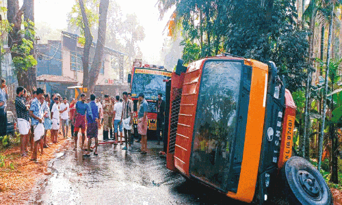 ഒതായി-അരീക്കോട് റോഡിൽ ലോറി മറിഞ്ഞ് അരമണിക്കൂർ ഗതാഗതം മുടങ്ങി