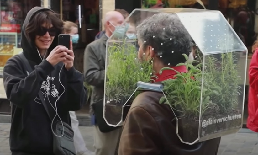 'എടുത്തുനടക്കാവുന്ന മരുപ്പച്ച' എന്ന് അലൈൻ വിശേഷിപ്പിക്കുന്ന മുഖാവരണം പെട്ടിപോലിരിക്കുന്ന ഒരു കുഞ്ഞൻ പ്ലെക്സിഗ്ലാസ് ഹരിതഗൃഹം തന്നെയാണ്. അതിനകത്ത് സുഗന്ധം പരത്തുന്ന ചില ഒൗഷധ സസ്യങ്ങളുമുണ്ട്. 61കാരനായ അലൈൻ വെർഷ്വെരൻ 15 വർഷം മുമ്പാണ് 'പോർട്ടബ്ൾ ഒയാസിസി'െൻറ ആശയം വികസിപ്പിക്കുന്നത്. കോവിഡ് പടർന്നുപിടിച്ചതോടെ അതേ ആശയം അദ്ദേഹം വീണ്ടും പൊടിതട്ടിയെടുത്തു.