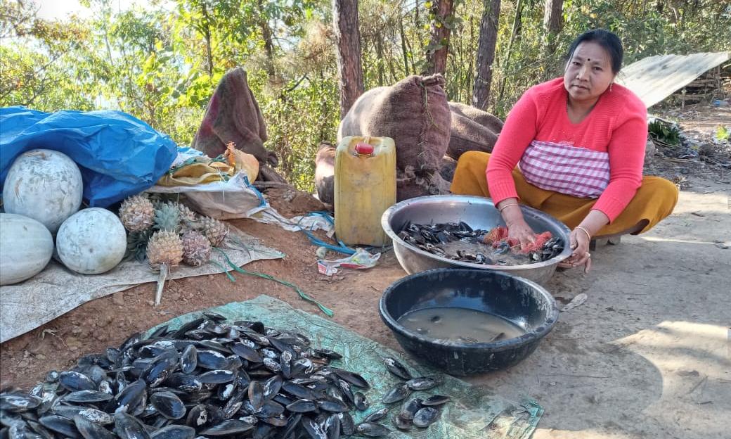 പത്തു പതിനഞ്ചു പേരുണ്ട് വിൽപ്പനക്കാരായി. ചന്തമുള്ള മണിപ്പൂരി മഹിളകൾ. അവർക്ക് ചുറ്റും വർണ്ണഭംഗിയുള്ള പഴക്കൂടകൾ. കൈതച്ചക്കയും വാഴപ്പഴങ്ങളും ഓറഞ്ചും മുന്തിരിയും മാതളവും തണ്ണിമത്തനും ആപ്പിളും പേരക്കയും മാമ്പഴവുമടങ്ങുന്ന പഴവർഗങ്ങളാണ് അധികവും. കൂടെ പച്ചക്കറികളും കായൽ മത്സ്യങ്ങളുമുണ്ട്. കക്കയും ഞണ്ടും ഞവണിക്കയും ഒച്ചും എല്ലാമുണ്ട്.