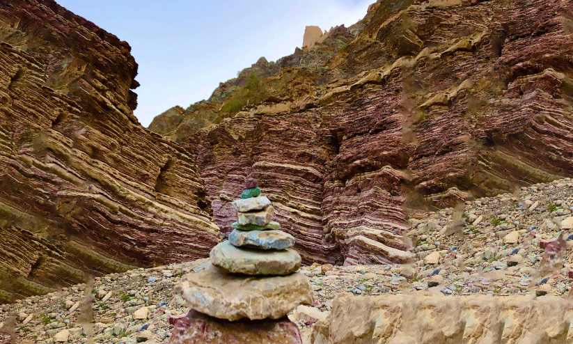 തട്ടുതട്ടായി അടുക്കിവെച്ചപ്പോലെ ഇതളാർന്ന പാറകളിൽ നിന്ന് അടിസ്ഥാന വർണങ്ങളായ ചുവപ്പ്, നീല, പച്ച എന്നിവ ഒഴുകി പടർന്ന് മഴവില്ലു രചിക്കുന്നത് കാണാൻ ഒരു സാഹസിക യാത്ര അനിവാര്യമാണ്. ഇന്നലെ വരെയുള്ള മുൻഗാമികൾ പലപ്പോഴായി പലവട്ടം നടന്നുപോയി വഴികളായി തീർന്ന കരിംപ്പാറകൾക്കിടയിൽ പ്രകൃതിയുടെ മാന്ത്രികത കാണേണ്ട കാഴ്ച്ചയാണ്. ഒമാനുമായി അതിർത്തിപങ്കിടുന്ന ചിലഭാഗങ്ങൾ ഈ മലമടക്കുകൾക്കിടയിൽ കിടക്കുന്നതിനാൽ ചിലപ്പോൾ യാത്രക്ക് അനുമതി തേടേണ്ടി വന്നേക്കാം. അനുമതിയില്ലാതെ യാത്ര ചെയ്താൽ ചിലപ്പോൾ തിരികേ പോരേണ്ടതായും വരാം. അതുകൊണ്ടുതന്നെ ബന്ധപ്പെട്ടവരുമായി ബന്ധപ്പെട്ടതിന് ശേഷം മാത്രം സാഹസിക യാത്ര തുടങ്ങുന്നതാണ് അഭികാമ്യം. ഫുജൈറയുടെ മനോഹരിയായ ഘുബ് ഗ്രാമത്തിൽ നിന്നാണ് യാത്രയുടെ തുടക്കം. കയറും തോറും ശൂലപാളികളായി മാറുന്ന പാറകൾ, അതിൻറെ ലക്ഷ്യ സ്ഥാനത്ത് എത്തുമ്പോൾ ഒരു പുസ്തകത്തിലെ താളുകൾ പോലെയാകും. അതിൽ നിന്നും പ്രകൃതിയുടെ അഭൌമ സൌന്ദര്യം വാക്കുകളായി ഒഴുകി പരക്കുന്നത് കാണാം.