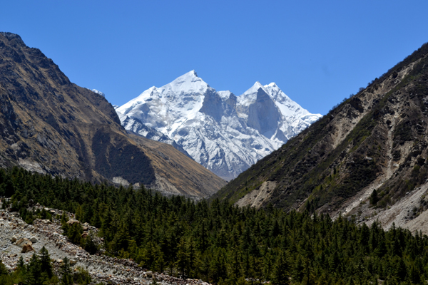 ഏതാണ്ട് ഒമ്പതു കിലോ മീറ്റര് നടന്നെത്തിയപ്പോഴേക്കും ശരീരം വിശ്രമത്തിനായി കൊതിച്ചുതുടങ്ങി. അതിനു വേണ്ടിത്തന്നെ പ്രകൃതിയൊരുക്കിയ ഒരിടമായിരുന്നു ചീട്ബാസ്സ. ഏതാണ്ട് പന്ത്രണ്ടായിരം അടി ഉയരത്തിലാണ് ഈ സ്ഥലം. ചീട് എന്നാല് പൈന്മരം തന്നെ. പേരു സൂചിപ്പിക്കുന്നതുപോലെ പൈന്മരങ്ങള് തിങ്ങി വളര്ന്നിരുന്ന സ്ഥലം തന്നെയത്. തണലിടങ്ങള് വേണ്ടുവോളമായിരുന്നു. ചീട്ബാസ്സയില് യാത്രക്കാരെ കാത്തിരിക്കുന്ന ഒരു കൊച്ചു ചായക്കടയുമുണ്ട്. പിന്നെ ഒരു വനപാലകകേന്ദ്രവും. അവിടത്തെ പൈന്മരത്തണലില് അല്പനേരം കണ്ണടച്ചുകിടന്നു. ചൂടുള്ള ഒരു ചായയും കൂടിയായപ്പോള് ക്ഷീണം മാഞ്ഞു. ചീട്ബാസ്സയില് നിന്നും അകലുന്തോറും പ്രകൃതി വളരേയധികം മാറിത്തുടങ്ങി. മരങ്ങള് കുറഞ്ഞു. ഹരിതാഭ, വരണ്ട തവിട്ടുനിറത്തിലേക്ക് വഴിമാറി. ആര്ട്ടിക് തുന്ദ്ര എന്നൊക്കെ ഈ പ്രദേശത്തെ വിശേഷിപ്പിക്കാറുണ്ടത്രെ. ചുറ്റുവട്ടത്തും കൂറ്റന് കുന്നുകള്. അവയോരോന്നും കയറിയിറങ്ങിയായിരുന്നു ഞങ്ങളുടെ യാത്ര. കഷ്ടിച്ച് ഒറ്റയടിവെക്കാന് മാത്രം വീതിയുള്ള പാതകൾ. മാത്രവുമല്ല, മലമുകളില് നിന്നും മണ്ണും കല്ലും ഏതുനിമിഷവും താഴേക്ക് ഇടിഞ്ഞിറങ്ങിക്കൊണ്ടുമിരിക്കും. ഉറപ്പിച്ച ഒരു പ്രതലത്തില് കാലുറപ്പിക്കാന് പോലുമാവില്ല. കാലിനടിയില് നിന്നും മണ്ണുചോര്ന്നു പോവുക എന്നൊക്കെ സാഹിത്യഭംഗിയില് പറയാമെങ്കിലും, യഥാര്ത്ഥത്തില് അതനുഭവിച്ചു. കാലൊന്നു തെറ്റിയാല് ആയിരത്തിലധികം മീറ്റര് താഴേക്കാണ് പതിക്കുക. അശ്രദ്ധയുടെ ഒരു മിന്നായം മതി, നിമിഷങ്ങള്ക്കകം അഗാധതയില് ഭാഗീരഥിയുടെ ഓളങ്ങളില് ചെന്നുചേരാൻ. ചീട്ബാസയിൽ നിന്നുള്ള ദൃശ്യം. ഭാഗീരഥി സഹോദരിമാര് എന്നറിയപ്പെടുന്ന മൂന്ന് കൊടുമുടികള്