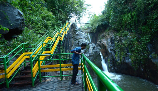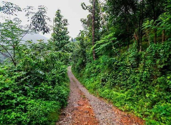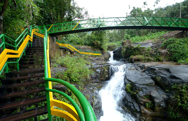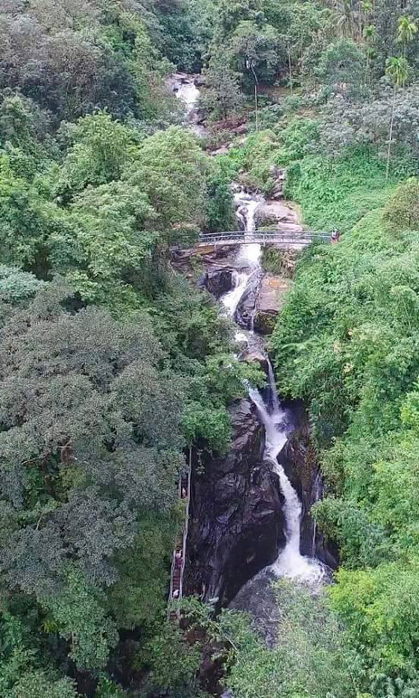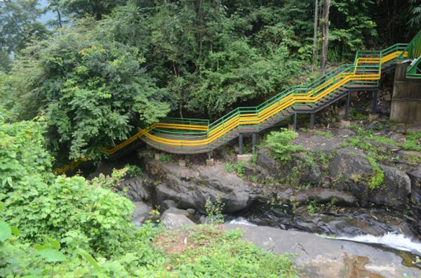 പച്ചപുതച്ച് ആകാശത്തെ തൊട്ടുനില്ക്കുന്ന കൂമ്പന്മല ദൂരെ കാണാം. വെള്ളച്ചാട്ടത്തിന് മൂന്ന് കിലോമീറ്റര് ഇപ്പുറം വരെ മാത്രമേ വാഹനം പോകൂ. ഇവിടുന്ന് മല കയറാന് ജീപ്പ് സര്വിസുണ്ട്. ഇനിയങ്ങോട്ട് ബൈക്ക് യാത്ര ശുഭകരമാവില്ലെന്ന് റോഡരികില് പെട്ടിക്കട നടത്തുന്ന മധ്യവയസ്കന് പറഞ്ഞെങ്കിലും സാഹസികതക്കു തന്നെ മുതിര്ന്നു. വലിയ കരിങ്കല്ല് പാകിയ പാതയിലൂടെ, ഇരുവശങ്ങളിലും കായ്ച്ചു നില്ക്കുന്ന കൊക്കോ തോട്ടങ്ങള്ക്ക് നടുവിലൂടെ ഇളകിയാടി ബൈക്ക് നീങ്ങി. ദൂരം പോകുംതോറും യാത്ര കൂടുതല് ദുഷ്കരമായി തുടങ്ങി. ഇടക്ക് റബര് തോട്ടങ്ങള്ക്കടുത്തെത്തുമ്പോള് മാത്രം നല്ല റോഡ് കണ്ടു. കുത്തനെയുള്ള കയറ്റത്തിലൂടെയുള്ള സഞ്ചാരം അല്പം കഠിനം തന്നെയാണ്. ജീപ്പില് കയറുന്നതാണ് ഉചിതം. റോഡ് അവസാനിക്കുന്നിടത്ത് ടിക്കറ്റ് കൗണ്ടറിനടുത്ത് വണ്ടി ഒതുക്കിനിര്ത്തി. 10 രൂപയുടെ ടിക്കറ്റെടുത്ത് മണ്പാതയിലൂടെ നടന്നു. കുറച്ചകലെയായി വെള്ളം താഴേക്ക് പതിക്കുന്ന ശബ്ദം കേട്ടുതുടങ്ങി.