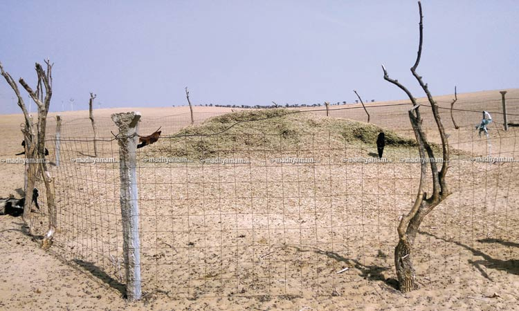 സംശയത്തോടെയാണ് അവർ ഞങ്ങളെ നോക്കുന്നത്. അങ്ങോട്ട് പൊയ്ക്കൂടേയെന്ന് ചോദിച്ചു ഞങ്ങൾ. ആദ്യം ഒന്നും മിണ്ടാതിരുന്ന അവർ പൊയ്ക്കോളാൻ കൈകൊണ്ട് ആംഗ്യം കാട്ടി. പിന്നെ കണ്ടത് ചതുരത്തിൽ കമ്പിവേലി കെട്ടിയ ഒരു കൂടാണ്. നടുവിൽ പുല്ല് കൂട്ടിയിട്ടിരിക്കുന്നു. ആടുകൾക്കുള്ളതാണത്. പച്ചപ്പുള്ള ഏതോ ഭാഗത്തുനിന്ന് കൊണ്ട് വരുന്ന പുല്ലുകൾ ഇൗ കമ്പിവേലിക്കൂട്ടിൽ കൂട്ടിയിട്ടിട്ടുണ്ട്. പകൽ നേരത്ത് മേച്ചിൽ കഴിഞ്ഞ് വരുന്ന ആട്ടിൻപറ്റം പിന്നെ ഇവിടെയാണ് കഴിയുക. മേയാൻ പോകാത്ത ഒന്നോ രണ്ടോ ആടുകളും കുറച്ച് പശുക്കളും അവിടവിടെയായി ബാക്കിയുണ്ട്.