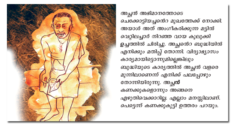 അച്ഛൻ അഭിമാനത്തോടെ ചെക്കോട്ടിയച്ചെൻറ മുഖത്തേക്ക് നോക്കി. അയാൾ അത് അംഗീകരിക്കുന്ന മട്ടിൽ വെറ്റിലച്ചാർ നിറഞ്ഞ വായ കുലുക്കിക്കൊണ്ട് ഉച്ചത്തിൽ ചിരിച്ചു. അച്ഛെൻറ ബുദ്ധിയിൽ എനിക്കും മതിപ്പ് തോന്നി. വിദ്യാഭ്യാസം കാര്യമായിട്ടൊന്നുമില്ലെങ്കിലും ബുദ്ധിയുടെ കാര്യത്തിൽ അച്ഛൻ വളരെ മുന്നിലാണെന്ന് എനിക്ക് പലപ്പോഴും തോന്നിയിരുന്നു. അച്ഛൻ കണക്കുകളൊന്നും അങ്ങനെ എഴുതിവെക്കാറില്ല. എല്ലാം മനസ്സിലാണ്. പെട്ടെന്ന് കണക്കുകൂട്ടി ഉത്തരം പറയും. അതുപോലെയാണ് തീയതികളും. മലയാള മാസവും വർഷവുമാണ് അച്ഛെൻറ മനസ്സിലുള്ളത്. 1114 ചിങ്ങം 24, 1123 വൃശ്ചികം 13 ഇങ്ങനെയാണ് അച്ഛൻ സംഭവങ്ങളും തീയതികളും ഓർമിച്ചെടുക്കാറുള്ളത്. ഒന്നിനും ഒരു പിശകുണ്ടാവില്ല.