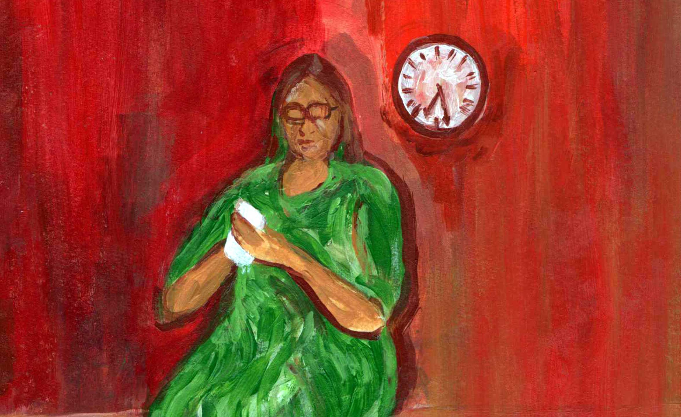 അവർ അകത്തു പോയി. അൽപസമയത്തിനുശേഷം നീണ്ട് മെലിഞ്ഞ ഒരു യുവതി ഇറങ്ങിവന്നു. പച്ചനിറത്തിലുള്ള നൃത്തസാരി, പിങ്ക് ബ്ലൗസും പാന്റും. നെറ്റിയിലെയും കഴുത്തിലെയും വിയർപ്പ് തോർത്തുമുണ്ടുകൊണ്ട് ഒപ്പിക്കൊണ്ടാണ് വരവ്. നീണ്ടു വിടർന്ന കണ്ണിലെ സാത്വികഭാവവും ചുണ്ടിലെ പുഞ്ചിരിയും ആശ്വാസമായി.