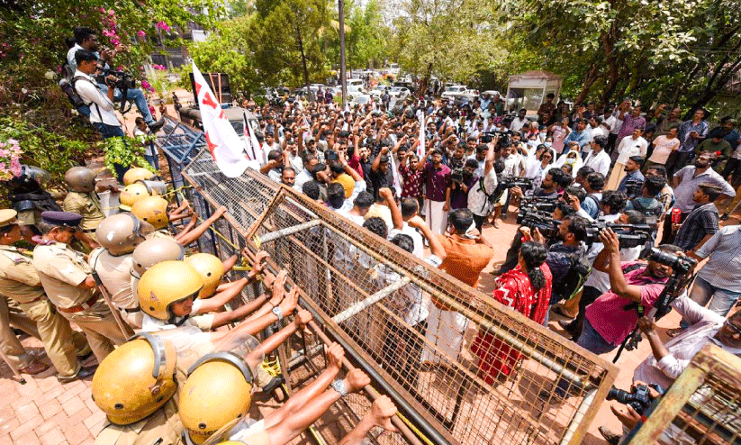 നിതിൻ രാജിന്റെ ദൂരൂഹമരണത്തിനെതിരെ എസ്.എഫ്.ഐ, ഡി.വൈ.എഫ്.ഐ പ്രവർത്തകർ കോളജിന് മുന്നിൽ നടത്തിയ പ്രതിഷേധം