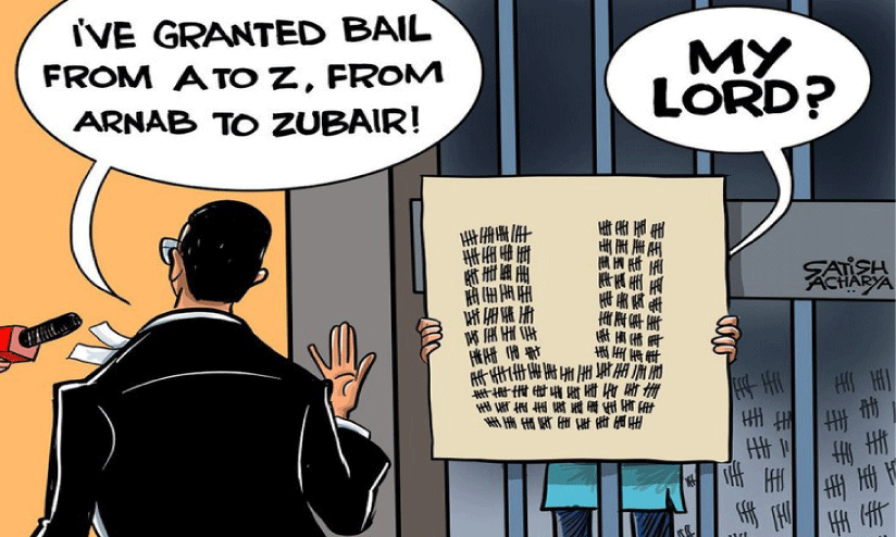 camera_altഉമർഖാലിദിനും ഷർജീൽ ഇമാമിനും ജാമ്യംനിഷേധിച്ച സുപ്രീംകോടതി തീർപ്പിനെപ്പറ്റി ജയ്പൂർ ലിറ്ററേച്ചർ ഫെസ്റ്റിവലിൽ ജേണലിസ്റ്റ് വീർ സങ്വി മുൻ ചീഫ് ജസ്റ്റിസ് ഡി.വൈ. ചന്ദ്രചൂഡിനോട് ചോദിച്ചു. ജാമ്യനിഷേധം ശരിയല്ലെന്ന നിലക്ക്, ‘‘ജാമ്യമാണ് നിയമം’’ എന്ന് ഊന്നിപ്പറയുകയാണ് ചന്ദ്രചൂഡ് ചെയ്തത്. എന്നാൽ അദ്ദേഹം ചീഫ് ജസ്റ്റിസായിരുന്നപ്പോൾ ഇവർക്ക് ജാമ്യം കിട്ടിയില്ലെന്ന് ചൂണ്ടിക്കാട്ടുന്നു പലരും. പദവി ഒഴിയുന്ന വേളയിൽ, ‘‘എ മുതൽ സെഡ് വരെ’’യുള്ളവർക്കൊക്കെ താൻ ജാമ്യമനുവദിച്ചെന്ന് അദ്ദേഹം അവകാശപ്പെട്ടപ്പോൾ (2024ൽ) സതീഷ് ആചാര്യ വരച്ച കാർട്ടൂൺ. A മുതൽ Z വരെ എല്ലാവർക്കും; പക്ഷേ U പോലെ ചില അക്ഷരങ്ങൾ വിട്ടുപോയി