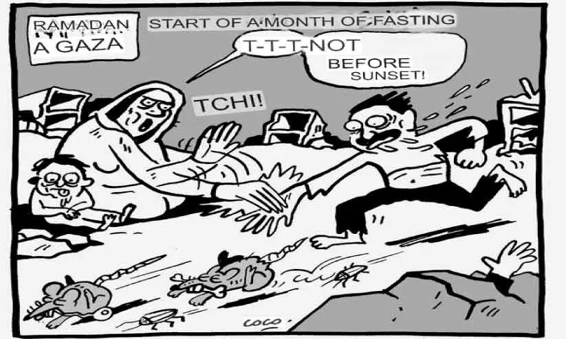 ഗസ്സയാണ് ചിത്രത്തിൽ. പട്ടിണിക്കാരായ മാതാപിതാക്കളും കുഞ്ഞും. തകർന്ന കെട്ടിടാവശിഷ്ടങ്ങളിൽനിന്ന് കൊല്ലപ്പെട്ടയാളുടെ കൈ പുറത്തേക്ക് നീണ്ടുകിടക്കുന്നു. എച്ചിൽ എല്ലുമായി രണ്ട് എലികൾ പാഞ്ഞുപോകുന്നു. ആർത്തിയോടെ പിതാവ് അത് തട്ടിപ്പറിക്കാനോടുന്നു. അപ്പോൾ മാതാവ് പറയുന്നു: ‘‘അയ്യോ വേണ്ട, സൂര്യനസ്തമിക്കുന്നതുവരെ പറ്റില്ല.’’ കാർട്ടൂണിന് മേൽക്കുറിപ്പായി ഇങ്ങനെ: ‘‘ഗസ്സയിലെ റമദാൻ –വ്രതമാസത്തിന് ആരംഭമായി.’’