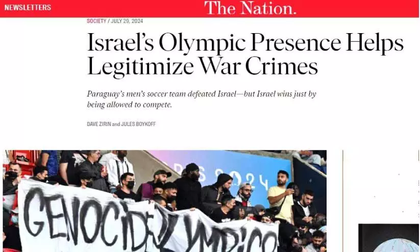 ഇസ്രായേലി അത്ലറ്റുകൾ വെറും കായിക താരങ്ങളല്ല. അവരെല്ലാം ഇസ്രായേലി സൈന്യത്തിന്റെ ഭാഗമാണ്. ഗസ്സയിലേക്ക് തൊടുക്കാനുള്ള ബോംബിന്മേൽ ‘‘ഫലസ്തീൻ കുട്ടികളെ, നിങ്ങൾക്ക് എന്റെ വക’’ എെന്നഴുതി ഒപ്പിട്ട പീറ്റർ പാൾച്ചിക് ആണ് ഒളിമ്പിക്സ് പരേഡിൽ ഇസ്രായേലിന്റെ പതാക വഹിച്ചത്. അയാൾ അടങ്ങുന്ന ഇസ്രായേലി സേന നടത്തുന്ന വംശഹത്യക്കിടെ കൊല്ലപ്പെട്ടവരിൽ 340ലധികം ഫലസ്തീൻ കായികതാരങ്ങളുമുണ്ട്; 69 ഒളിമ്പ്യൻമാരുണ്ട്.