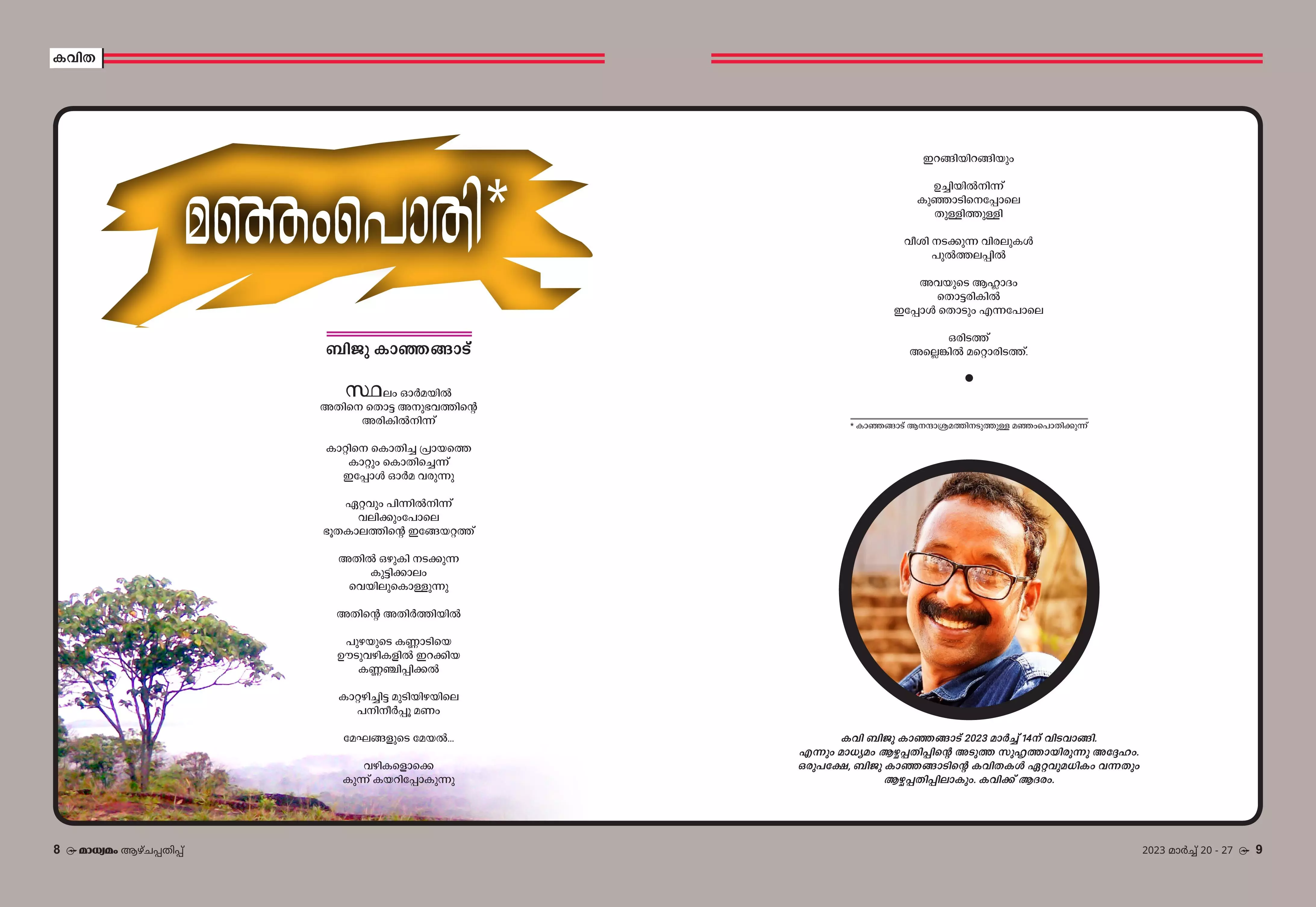 17 വർഷം മുമ്പാണ് ബിജു കാഞ്ഞങ്ങാടിന്റെ ആദ്യ കവിതാ സമാഹാരം ‘തൊട്ടുമുമ്പ് മഞ്ഞയിലയോട്’ എന്ന കവിത ഡി.സി ബുക്സിലൂടെ പുറത്തുവന്നത്. കവിതയിൽ പുതിയൊരു ദൃശ്യഭാഷ അത് നമുക്ക് കാട്ടിത്തന്നു. പിന്നീട് വന്ന ‘അഴിച്ചുകെട്ട്’ പുതിയ ചിത്രഭാഷയിൽ കവിതയെ അഴിച്ചുകെട്ടി. ‘ജൂൺ’ എന്ന പ്രണയകവിതയിൽ പ്രകൃതിയുടെ വിവിധ പ്രണയഭാവങ്ങൾ പകർന്നുതന്നു. അതിലെ ‘കുളത്തിൽ പച്ച’ എന്ന കവിതയിൽ,