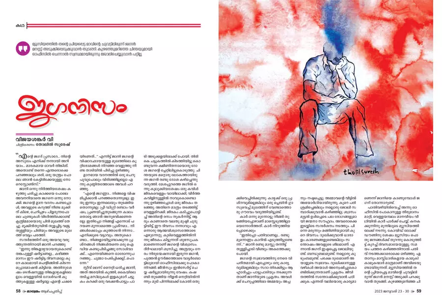 നിങ്ങളിൽ ഇങ്ങനെയൊക്കെ തോന്നുന്ന ഒരാളുണ്ടോ? അല്ലെങ്കിൽ ഇങ്ങനെ അമിത ഉത്കണ്ഠ എന്തിലും കാണിക്കുന്ന ഒരാളെ നിങ്ങൾ എന്നെങ്കിലും കണ്ടിട്ടുണ്ടാകും. ആ മാനസികാവസ്ഥയെ വളച്ചുകെട്ടലുകളൊന്നും ഇല്ലാതെ അൽപം അയഞ്ഞ മട്ടിൽതന്നെ അവതരിപ്പിച്ചിരിക്കുന്ന കഥയാണ് വിജയശങ്കർ വി എഴുതിയ ‘ജഗനിസം’ (ലക്കം: 1300).