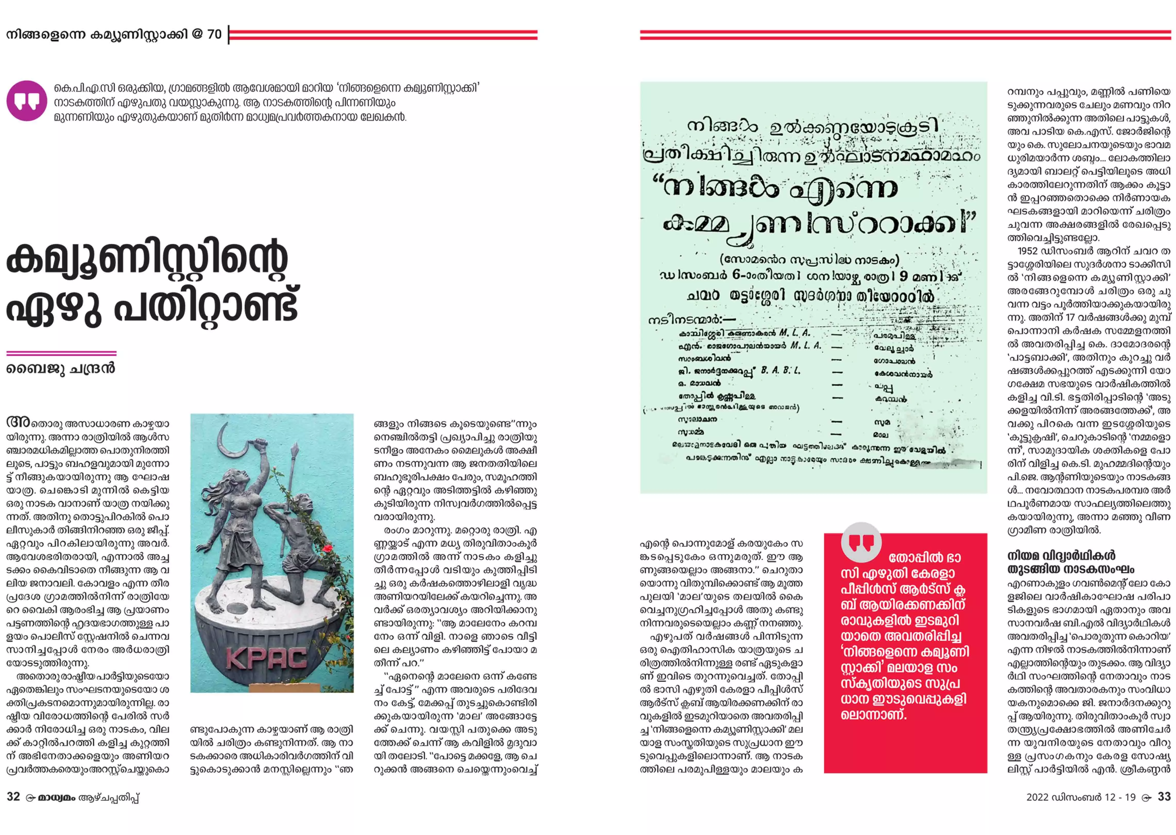 ‘നിങ്ങളാരെ കമ്യൂണിസ്റ്റാക്കി?‘നിങ്ങളെന്നെ കമ്യൂണിസ്റ്റാക്കി’ എന്ന പേരിൽ ഏഴ് ദശാബ്ദങ്ങൾക്കു മുമ്പുണ്ടായ വിഖ്യാത നാടകത്തെ അതിന്റെ സപ്തതിവർഷത്തിൽ ഇന്നത്തെ രാഷ്ട്രീയ പശ്ചാത്തലത്തിൽ ബൈജു ചന്ദ്രൻ ഓർത്തെടുത്തത് നന്നായി (ലക്കം: 1294). കമ്യൂണിസം ഒരു വൈകാരികാവേശം മാത്രമാണ്. അതിന് ഒരു വ്യവസ്ഥാപിത ഭരണവർഗ പാർട്ടികളിൽനിന്നും വ്യത്യസ്തമായ രാഷ്ട്രീയ പരിപ്രേക്ഷ്യങ്ങളുണ്ടെന്ന്...