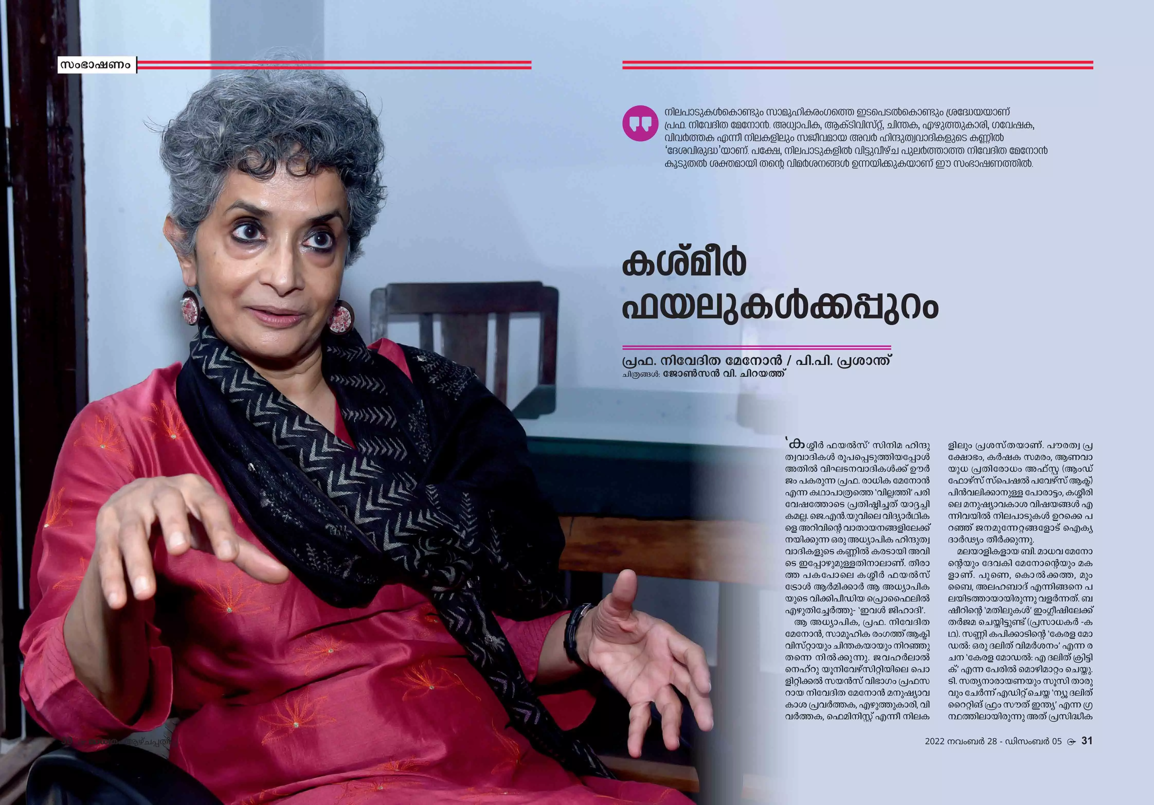 പ്രഫ. നിവേദിത മേനോനുമായി പി.പി. പ്രശാന്ത് നടത്തിയ അഭിമുഖം കേന്ദ്രം ഭരിക്കുന്നവർ നിരന്തരം നടത്തിക്കൊണ്ടിരിക്കുന്ന ഗൂഢതന്ത്രങ്ങൾ വായനക്കാർക്ക് മനസ്സിലാക്കാൻ സഹായകരമായി (ലക്കം: 1292). ബോളിവുഡ് ചിത്രം ‘കശ്മീർ ഫയൽസ്’ എന്ന ചിത്രത്തിനെതിരെ ഗോവ ചലച്ചിത്രമേളയുടെ സമാപന ചടങ്ങിൽ വിമർശനം ഉന്നയിച്ചത് ഇസ്രായേലുകാരനായ നദവ് ലപിഡാണ്. വിദ്വേഷപ്രചാരണ ചിത്രത്തിന് മേളയിൽ മത്സരിക്കാൻ എങ്ങനെ സാധിച്ചു എന്നാണ് നദവ് ചോദിച്ചത്. ഇസ്രായേലുകാരന് മോദിയെ ഭയപ്പെടേണ്ടതില്ലല്ലോ..!