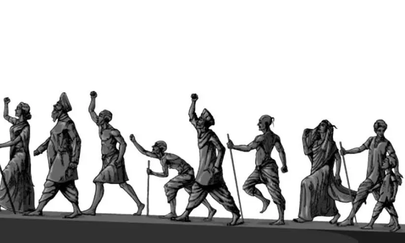 2025 ജനുവരി 301 രാജ്ഘട്ടിൽനിന്ന് ബാപ്പു ഇറങ്ങിനടന്നു 2025 മാർച്ച് 232 സത്ലജ് നദിയിൽനിന്ന് ഭഗത് കരക്കു കയറി നടന്നുനടന്ന് ബാപ്പു വൈക്കത്തെത്തി മനപ്പടിക്കൽനിന്ന് മനമുകളിൽ നോക്കി മേൽക്കൂര തുളച്ച് ഒരു കൊടിയടയാളം3 ബാപ്പു മോണകാട്ടി ചിരിച്ചു ഭഗത് കേരളത്തിന്റെ വടക്കാണെത്തിയത് നിർത്താത്ത നടത്തം ഇരുവരെയും മധ്യകേരളത്തിലെ ഒരു കൊച്ചുഗ്രാമത്തിലെത്തിച്ചു മുഖാമുഖം കണ്ട അവർ ശിവേട്ടന്റെ ചായക്കടയിലേക്ക് കയറി ‘‘ചിത്രത്തിൽ കാണണപോലെതന്നെണ്ട്. ആഗസ്റ്റ് 15ന്റെ പരിപാട്യാവും ലെ, മൂന്നാൾക്കും എന്താ വേണ്ട്?’’ മൂന്നാൾ ബാപ്പുവും ഭഗതും തിരിഞ്ഞുനോക്കി പട്ടാളവേഷത്തി- ലൊരാൾ; ബോസ് എന്ന് നടന്നു തുടങ്ങി? എപ്പോൾ...