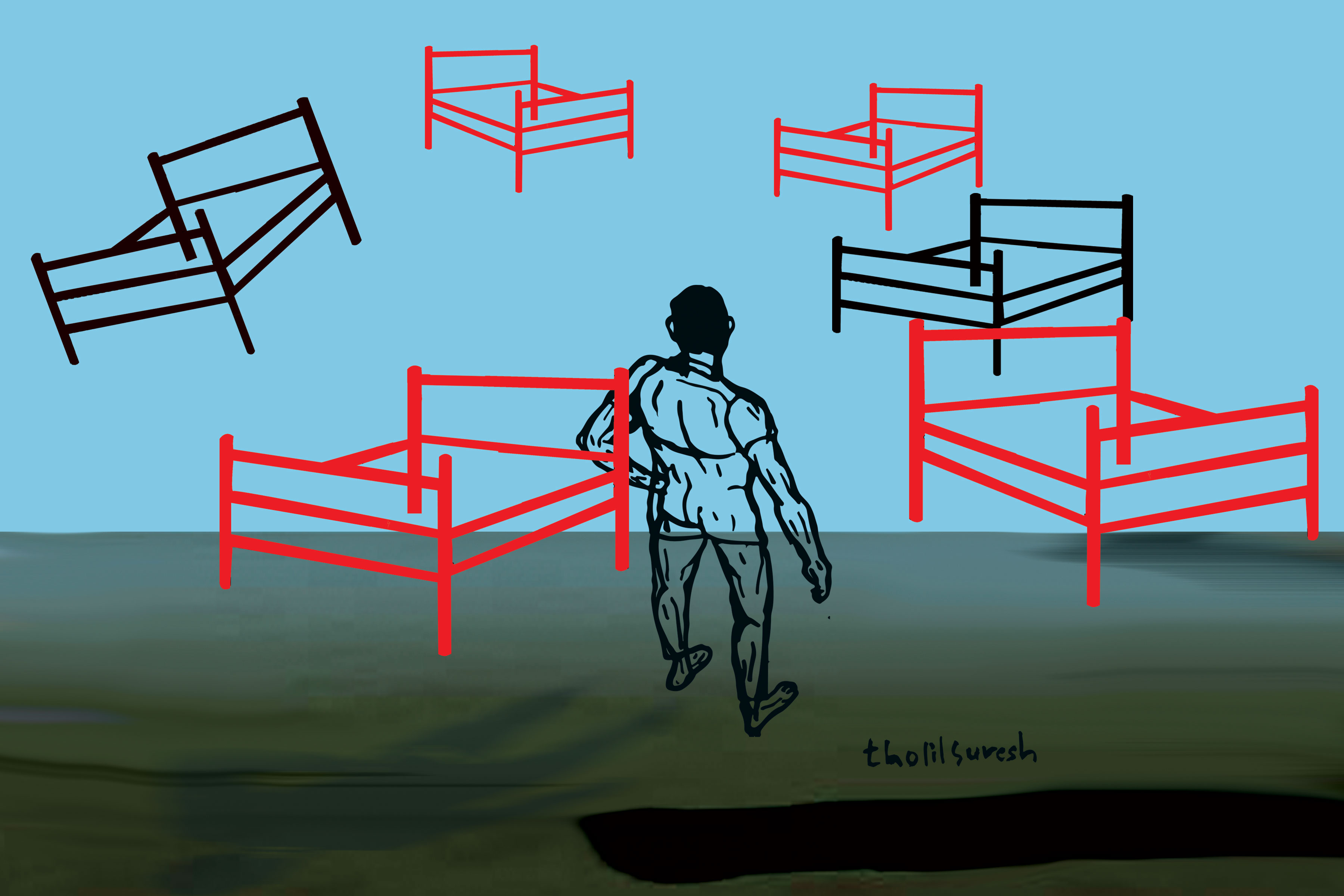 തന്റെ ചുറ്റിലും കിടക്കുന്നവർ കട്ടിലടക്കം വായുവില് ഉയർന്നുനിൽക്കുന്നതായി ആപ്തെ കണ്ടു. നെഞ്ചിൽ ആണിയടിക്കുന്നതുപോലെയാണ് അവരുടെ കൂർക്കംവലി.