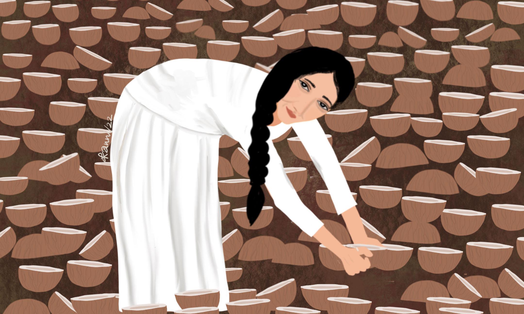കുഞ്ഞ് പിച്ചവെച്ച് തുടങ്ങിയ കാലത്താണ് നമ്പൂതിരിയെ കാണാതായത്. നാടൊട്ടുക്കും അന്വേഷണം തുടങ്ങി. ഒടുക്കം വാണിയാപുരത്തെ കുടീന്ന് ഉടുതുണിയില്ലാതെ പൊക്കി, രാത്രിക്കു രാത്രി കെട്ടുവള്ളത്തിൽ ഇളംകുന്നത്തു കൊണ്ടുവന്നു. കരിക്കലുവരെ നാളികേരം ഉടയ്ക്കാനായിരുന്നു ശിക്ഷ. കൊപ്രാത്തറയിലെ പൊരിവെയിലിൽനിന്ന് ശിവ... ശിവ... എന്നുരുവിട്ട് നമ്പൂതിരിയുടെ ദേഹം തളർന്നു. നിർത്തുമ്പോഴൊക്കെ അടിമപ്പെണ്ണുങ്ങൾ വീറോടെ കാളക്കയറിന് അടിച്ചു. ചക്കിലെ ആട്ടെണ്ണപോലെ തിളക്കമുള്ള അവരുടെ മാറ് നിറഞ്ഞ സന്തോഷത്താൽ തുള്ളിയിളകി.