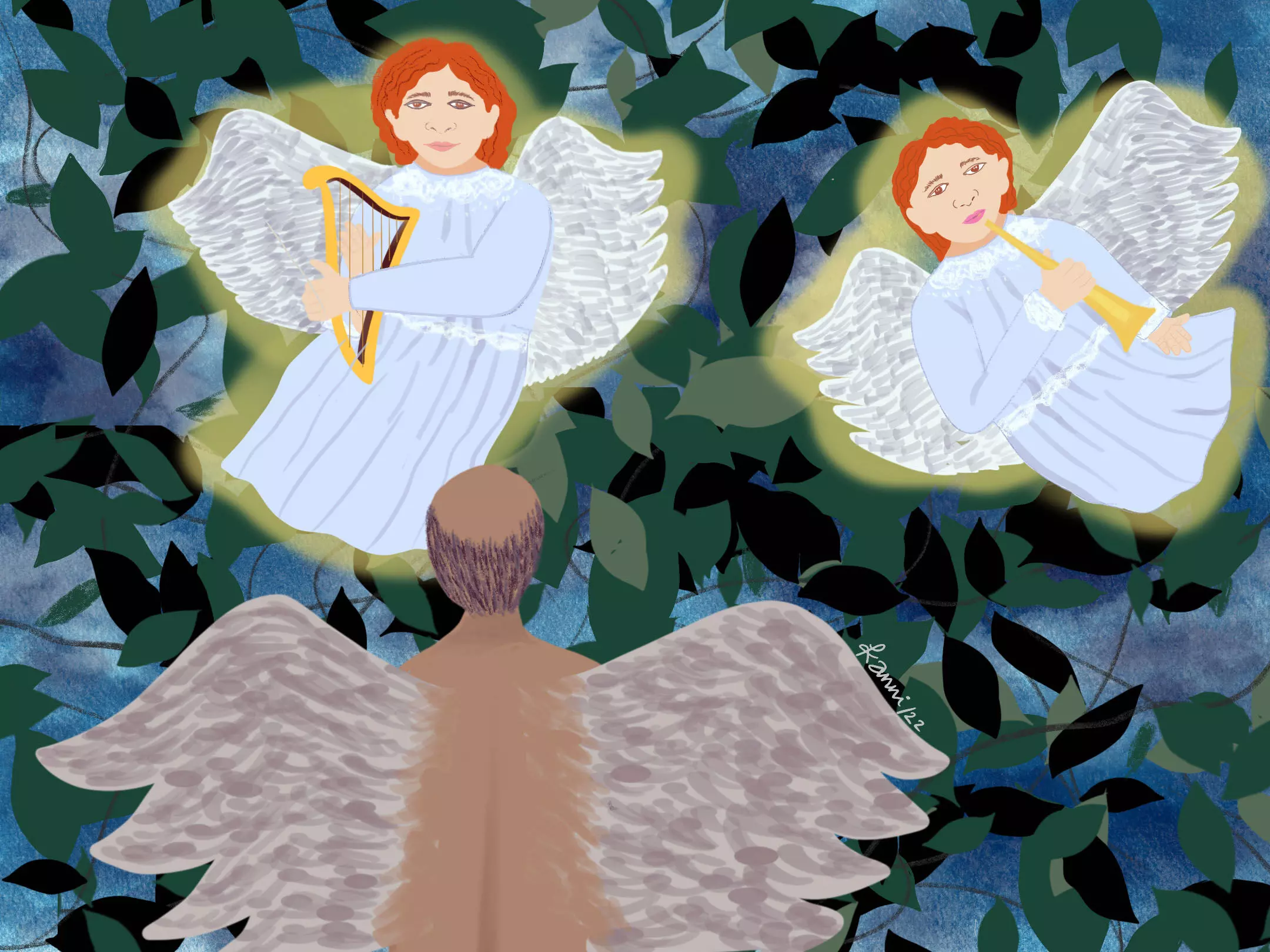 ആകാശത്തോളം വളരുന്ന അപ്പാപ്പന്റെ ശരീരം. ചുക്കിച്ചുളിഞ്ഞ മസിലുകളിലേക്ക് രക്തമിരച്ചു. ജര മാറി ഞരമ്പു തെളിഞ്ഞ തുട രണ്ടായി പിളർന്നൊരു മുളനാമ്പ് പുറത്തേക്ക് തലനീട്ടി. നോക്കിനിൽക്കുന്തോറും അതങ്ങനെ വളർന്നു പച്ചപ്പു നിറച്ച് ആകാശത്തെ മറച്ചുകൊണ്ടിരുന്നു. ഭൂമിയിൽ അതുവരെയുണ്ടായിരുന്നതും ചത്തുമണ്ണടിഞ്ഞതുമായ സകല പറവകളും അതിന്റെ ശിഖരങ്ങളിൽ ചേക്കേറി. അവറ്റകൾ ചേർന്നു പാടുന്ന ഗ്ലോറിയക്കൊപ്പം ചുവടുവെച്ച് ആകാശച്ചരിവിറങ്ങി മാലാഖമാരെത്തി. വെള്ളയും നീലയും ഇടകലർന്ന റേന്തക്കുപ്പായമിട്ടവരുടെ കൈയിൽ തങ്കത്തിളക്കമുള്ള വാദ്യോപകരണങ്ങൾ. നോക്കിനിൽക്കേ അപ്പാപ്പന്റെ തോളറ്റത്തേക്ക് കൂറ്റൻ ചിറകുവിരിഞ്ഞു വരുന്നത് മിഖായേൽ കണ്ടു. പൊടുന്നനെ ഞാറക്കമ്പും കവരേം തകർത്തുകൊണ്ടു അപ്പാപ്പൻ വാനദൂതർക്കൊപ്പം ആകാശത്തിലേക്ക് പറന്നുയർന്നു.