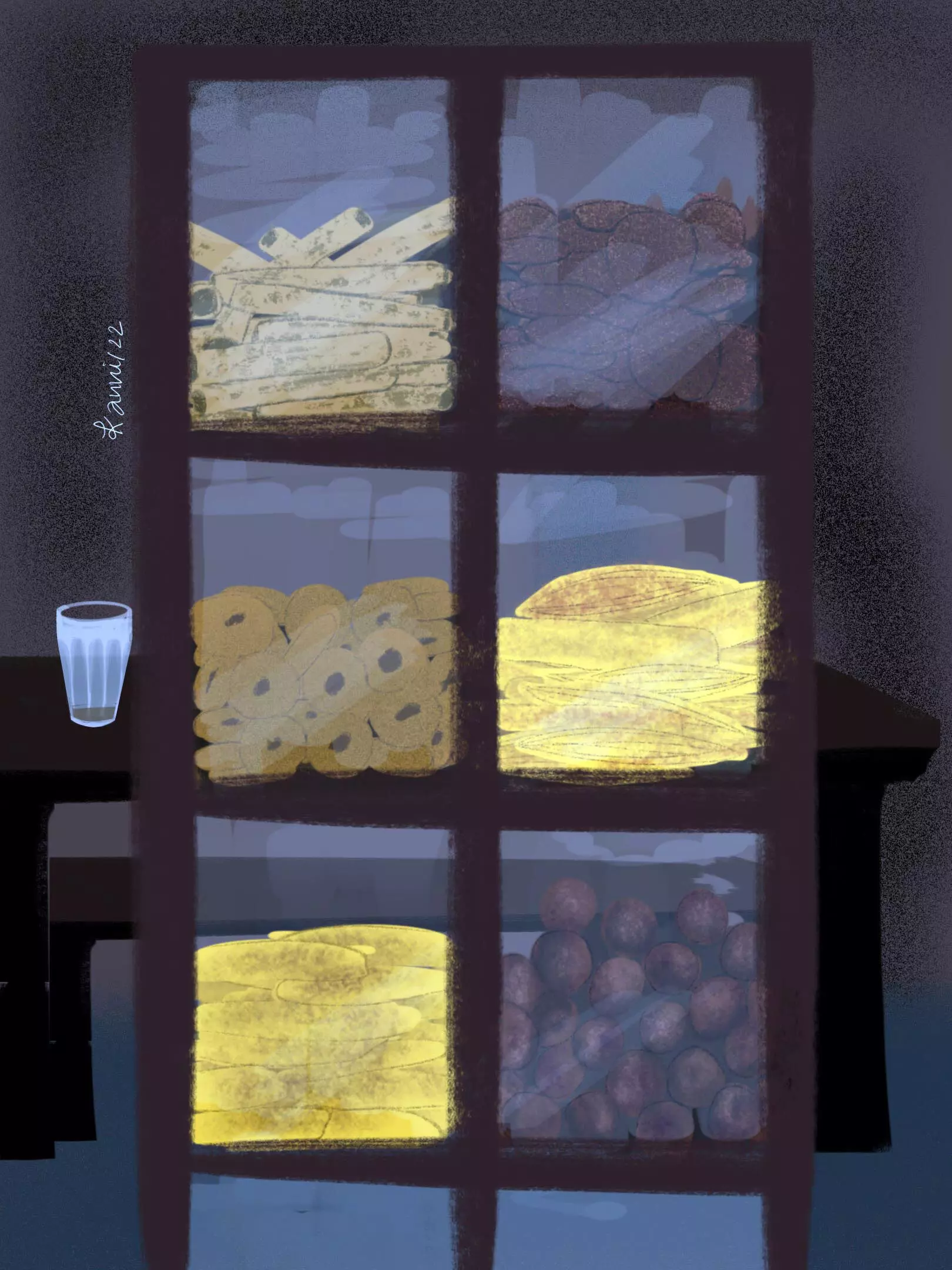 കുഞ്ഞുന്നാളു മുതലേ കുഞ്ഞാപ്പിക്ക് ചായക്കട ഇഷ്ടമായിരുന്നു. ചന്തക്കടവിലെ മാധവന്റെ ചായപ്പീടികയിലാണ് രായനെയും കുഞ്ഞാപ്പിയെയും അച്ചമ്മ കൂട്ടിക്കൊണ്ടുപോയിരുന്നത്. അവിടത്തെ പൊരിമണവും ചായമട്ടിന്റെ വേവുഗന്ധവും അവന്റെ മൂക്കിലെത്തി. ചില്ലലമാര നിറയെ എണ്ണ പലഹാരങ്ങളുണ്ടാവും. അരിതരം, ബോണ്ട, മടക്ക്, സവാളബജി, കുഴലപ്പം, അവുലോസുണ്ട, അവല് വിളയിച്ചത്, പഴംപൊരി, പരിപ്പുവട, ഉണ്ണിയപ്പം, മുറുക്ക്, പക്കാവട, ഉള്ളിവട, നെയ്യപ്പം, സുഖിയൻ, ഉണ്ടംപൊരി, അങ്ങനെ എത്രയെത്ര പലഹാരക്കൂട്ടങ്ങൾ.