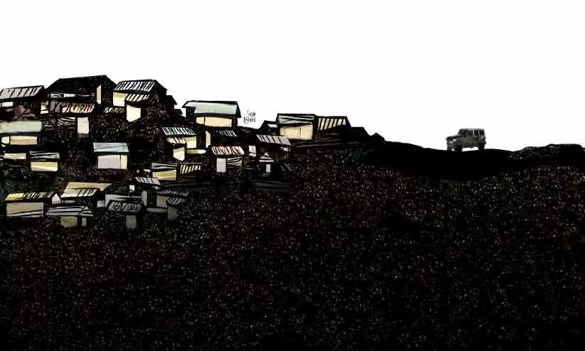 മേല്ക്കൂരയായി തകരമോ ഉപേക്ഷിക്കപ്പെട്ട ആസ്ബസ്റ്റോസ് ഷീറ്റുകളോ മേഞ്ഞിരിക്കുന്നു. വൈകുന്നേരത്തിന്റെ വിളറിയ വെളിച്ചങ്ങള് ആ വീടുകള്ക്കുമേല് പരന്നുകിടന്നു. ഉള്ളില് മുനിഞ്ഞുകത്തുന്ന വൈദ്യുതി ബള്ബുകള്. മേല്ക്കൂരകളില്നിന്നും മുകളിലേക്ക് പുകപൊങ്ങുന്നുണ്ടായിരുന്നു. അത്താഴത്തിനുള്ള പാചകം നടക്കുന്നതാവാം. അന്തരീക്ഷത്തില് മസാലകളുടെ ഗന്ധം പടര്ന്നു.
