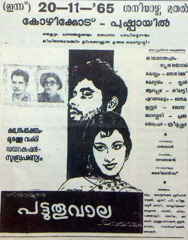 മുട്ടത്തു വർക്കിയുടെ പ്രശസ്ത നോവലിന്റെ ചലച്ചിത്രാവിഷ്കാരമായിരുന്നു 'പട്ടുതൂവാല'. 1965 നവംബർ 20ാം തീയതി തിയറ്ററുകളിൽ എത്തിയ 'പട്ടുതൂവാല' യിൽ മധുവായിരുന്നു നായകൻ, ഷീല നായികയും. ചിത്രത്തിൽ ആറു പാട്ടുകൾ ഉണ്ടായിരുന്നു. കമുകറ പുരുഷോത്തമൻ, പി. സുശീല, എൽ.ആർ. ഈശ്വരി, എൽ.ആർ. അഞ്ജലി എന്നിവർ പിന്നണിയിൽ പാടി. കമുകറ പുരുഷോത്തമനും പി. സുശീലയും പാടിയ യുഗ്മഗാനം ഇങ്ങനെ: ''ആകാശപ്പൊയ്കയിലുണ്ടൊരു/പൊന്നുംതോണി/അക്കരയ്ക്കോ ഇക്കരയ്ക്കോ/പൊൻമുകിൽ ഓലപ്പായ കെട്ടിയ/പൊന്നും തോണി...'' ശോകരസത്തിൽ ഉള്ള മറ്റൊരു യുഗ്മഗാനവും ജനശ്രദ്ധ നേടി- ''പൊട്ടിക്കരയിക്കാൻ മാത്രമെനിക്കൊരു/പട്ടുതൂവാല നീ തന്നു -അന്നൊരു/പട്ടുതൂവാല നീ തന്നു...'' എന്നിങ്ങനെ തുടങ്ങുന്ന ഈ ഗാനവും കമുകറയും പി. സുശീലയും ചേർന്നാണ് പാടിയത്. എൽ.ആർ. ഈശ്വരി പാടിയ ''പൂക്കൾ നല്ല പൂക്കൾ/കടലാസു പൂക്കൾ/വെയിലത്ത് വാടാത്ത/വെള്ളിയലുക്കിട്ട -വർണ/ക്കടലാസുപൂക്കൾ...'', പി. സുശീല പാടിയ ''സപ്തസാഗരപുത്രികളേ /സപ്തകിന്നരകന്യകളേ/നൃത്തമാടൂ നൃത്തമാടൂ/ദേവകുമാരികളേ'' എന്ന ഗാനവും ചിത്രത്തിൽ ഉണ്ടായിരുന്നു.