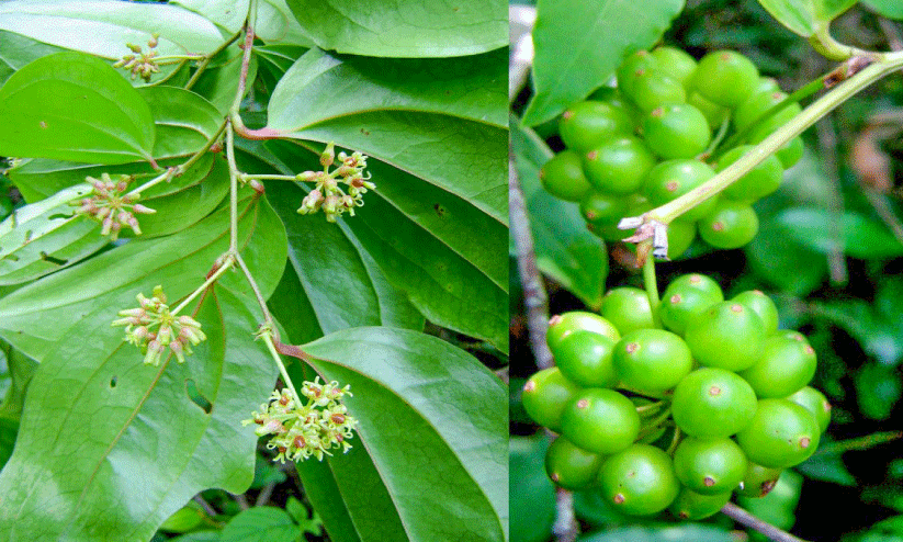 മേയ്-ജൂൺ മാസങ്ങളിൽ പൂക്കുന്നു. പത്രകക്ഷങ്ങളിൽനിന്നുള്ള ഛത്രമഞ്ജരിയിലാണ് പൂക്കളുണ്ടാകുന്നത്. പച്ചകലർന്ന മഞ്ഞനിറമുള്ള പൂക്കൾ ഏകലിംഗികളാണ്. ആൺ പൂക്കളിൽ സ്വതന്ത്രമായി നിലകൊള്ളുന്ന ആറ് കേസരങ്ങൾ കാണും. പെൺപൂക്കളുടെ അണ്ഡാശയത്തിന് മൂന്ന് അറകൾ. ഗോളാകൃതിയുള്ള ഫലങ്ങൾക്ക് കുരുമുളകിനേക്കാൾ വലിപ്പമുണ്ട്.