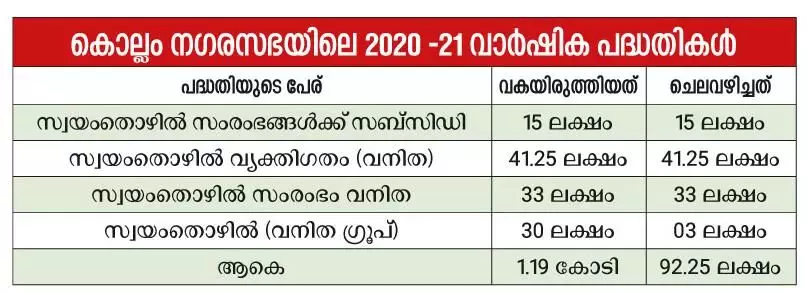 പ്രോജക്ട് ഓഫിസർ നഗര ദാരിദ്ര്യനിർമാർജന സെൽ നിർവഹണ ഉദ്യോഗസ്ഥനായി 2020-21ലെ വാർഷിക പദ്ധതിയിൽ ചിലത് നടപ്പാക്കി. രേഖകൾ പ്രകാരം പദ്ധതി നടപ്പിലാക്കുന്നതിന്റെ ഭാഗമായി ഗുണഭോക്താക്കൾ ബാങ്ക് ഓഫ് ഇന്ത്യയിൽനിന്നും വായ്പ എടുക്കും. അതിന്റെ സബ്സിഡി തുക നിർവഹണ ഉദ്യോഗസ്ഥൻ ബാങ്കിലേക്ക് കൈമാറും. പദ്ധതി വിഭാവനം ചെയ്തതുപ്രകാരം 2021 മാർച്ചിൽ തുക ബാങ്ക് ഓഫ് ഇന്ത്യയുടെ കടപ്പാക്കട ബ്രാഞ്ചിലേക്ക് കൈമാറി. എന്നാൽ, ഓഡിറ്റ് പരിശോധനയിൽ ബാങ്കിലേക്ക് കൈമാറിയ തുകയിൽ 13,76,200 – രൂപയിൽ 7,63,000– രൂപ കഴിഞ്ഞ 21 മാസക്കാലമായി ഉപയോഗിക്കാതെ കിടക്കുകയാണ്. ഗുണഭോക്താക്കൾ ബാങ്കിൽനിന്നും വായ് എടുത്തിട്ടില്ല. അതായത് ഏതാണ്ട് 55 ശതമാനവും ചെലവഴിച്ചിട്ടില്ല എന്നർഥം.