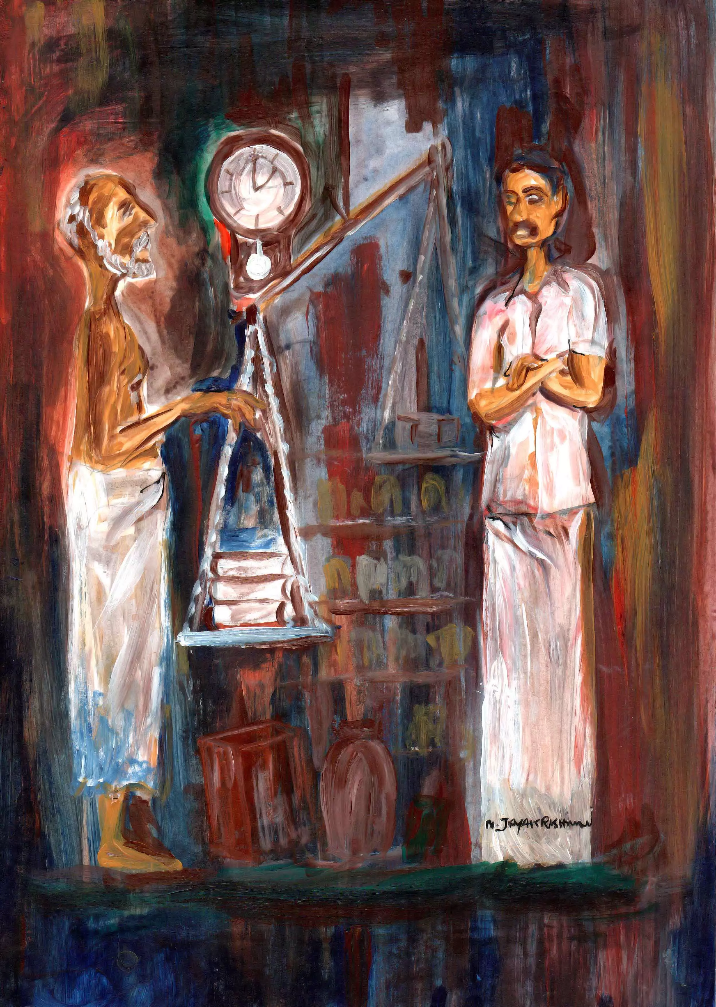 മുഖച്ചട്ട കീറിയ ദാരിദ്യ്രം പറയുന്ന ഏതോ പ്രസിൽനിന്നും പുറത്തിറങ്ങിയ ഒരു കൊച്ചുപുസ്തകമായിരുന്നു അത്. പത്തു കിലോയുടെ തൂക്കുകട്ടിയെടുത്ത് ഇടത്തേ തട്ടിലേക്ക് വെക്കുന്നതിനിടയിൽ അയാൾ ഇരുമ്പ് മണമുള്ള ഒരു ചുമയോടെ ചോദിച്ചു: