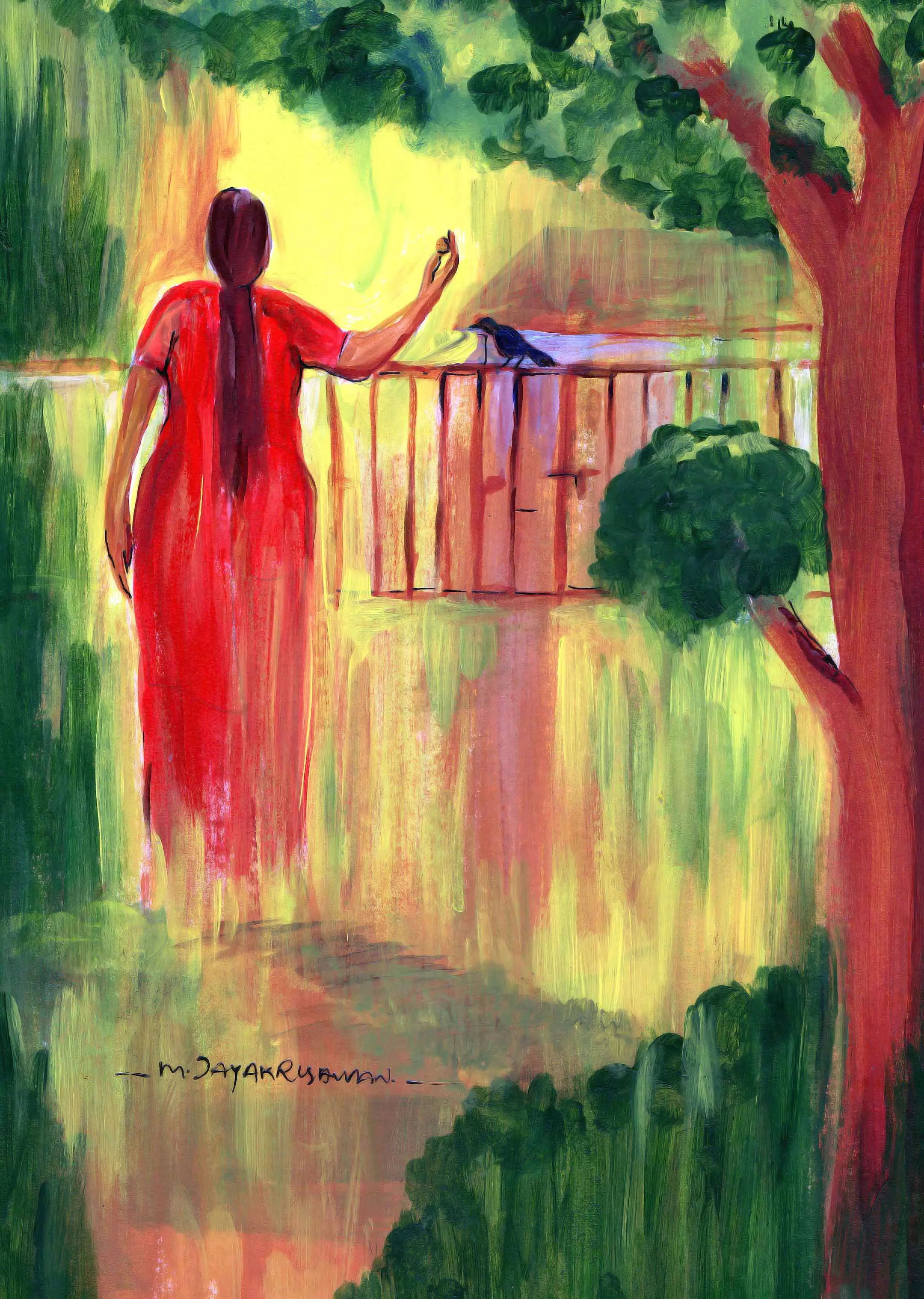 അത്രയും പറയാൻ ഇക്കാലമത്രയും ഓങ്ങിനടന്നതിന്റെ മുഴുവൻ ഊക്കോടുംകൂടി കുനിഞ്ഞ് ഒരു കല്ലെടുത്തെറിഞ്ഞ് അവൾ ആ കാക്കയെ ഓടിച്ചു. ശേഷം അതേ വേഗത്തിൽ അടുക്കളയിൽ പോയി ഒരു ചായയുമായി വന്നു. മുഖത്തു നോക്കാതെ, ഒരു കോപ്പ വിഷം വാങ്ങുന്ന അറപ്പോടെ ഹാജ്യാര് അത് വാങ്ങി മറിഞ്ഞുവീണേക്കാവുന്ന വിധം മൂന്നാമത്തെ പടിയുടെ വിളുമ്പിലേക്ക് ഭയത്തോടെ നീക്കിവെച്ചു. കാക്ക അടുത്ത മരച്ചില്ലയിലേക്ക് പറന്നിരുന്ന് കൂടുതൽ ഒച്ചയെടുത്ത് കാറി. ഹാജ്യാര് വെച്ചിട്ടുപോയ ചായയിൽ പതിനായിരം കാലുകളുള്ള ഒരു ജീവിയായി അന്തിവെളിച്ചം മലർന്നുകിടന്ന് ഇളകുന്നത് ഞാൻ കണ്ടു.