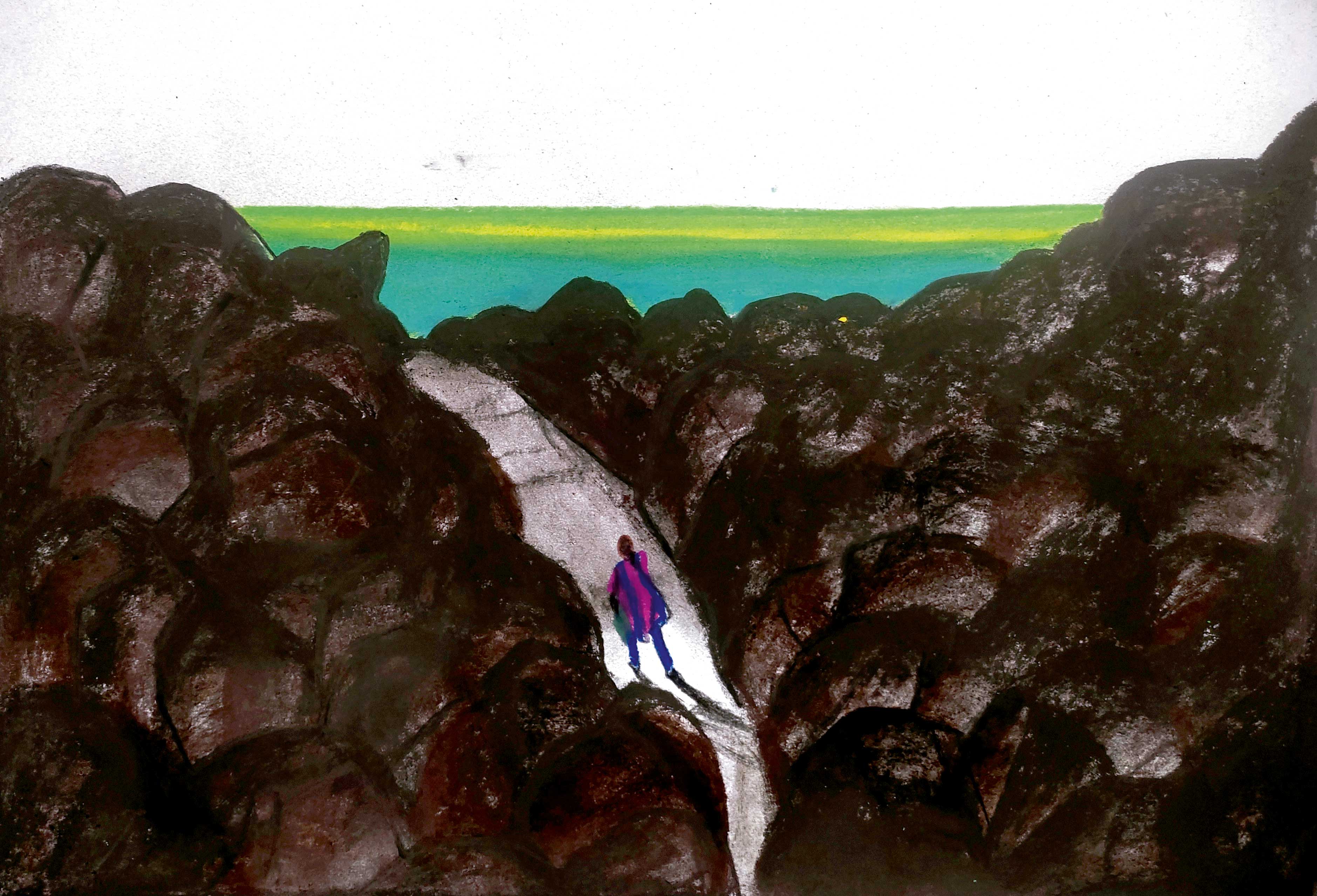 അയാൾ മുന്നേയിറങ്ങിക്കഴിഞ്ഞിരുന്നു. അവൾ അതൊഴിവാക്കാൻ വഴികാണാതെ നിന്നു. ബാ എന്നയാൾ വീണ്ടും വിളിച്ചു. അവൾ ആലോചിച്ചും നെടുവീർപ്പിട്ടും ഒടുവിൽ പിന്നാലേ പോകാൻതന്നെ തീരുമാനിച്ചു. അയാൾ തന്നെ പിടിച്ചുതിന്നാൻ പോകുന്നില്ലെന്നും എന്തെങ്കിലും അരുതായ്കക്കു മുതിർന്നാൽ അപ്പോൾക്കാണാമെന്നുമവൾ നിനച്ചു. അയാൾ മുന്നോട്ടുനീങ്ങിയപ്പോൾ, അവൾ കൈക്കിണങ്ങിയ ഒരു പാറക്കല്ലെടുത്തു ബാഗിൽ വെച്ചു. അപ്പോഴയാൾ തിരിഞ്ഞുനോക്കി. പക്ഷേ, അയാൾ കാണുംമുമ്പ് ശില സഞ്ചിയിലൊളിച്ചിരുന്നു. അവൾ ബാഗ് കൈയിൽ ഒന്നു തൂക്കി ഭാരമളന്നു. വീശിയടിച്ചാൽ അതുമതി, അയാളെ നിലംപതിപ്പിക്കാൻ എന്നു ധൈര്യമാർന്നു.