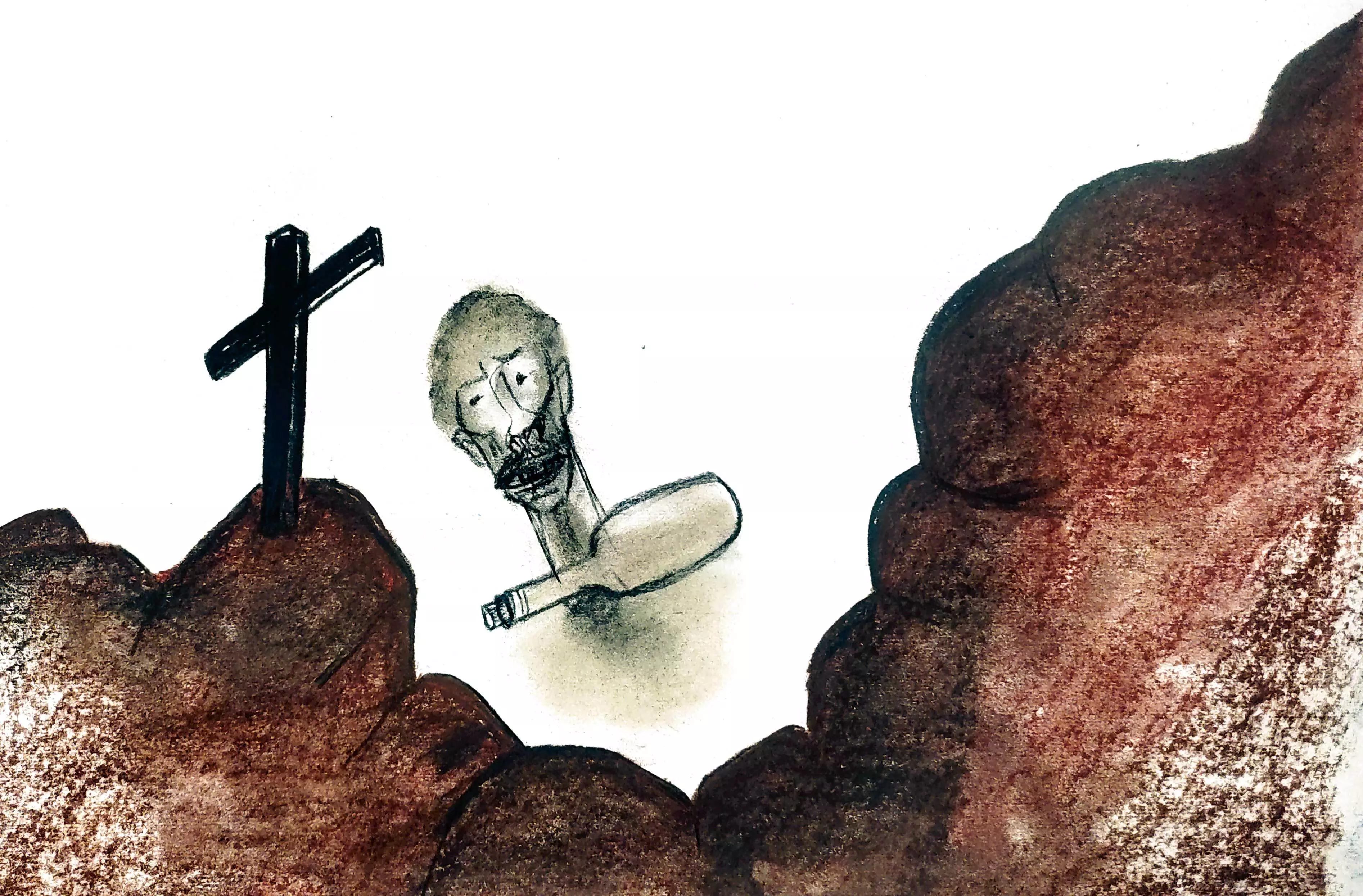 ഇടക്ക് അപരിചിത സഹയാത്രികൻ കുപ്പിപൊന്തിച്ച് അൽപംകൂടി കുടിച്ചു. അവളോടു വേണോ എന്നു ചോദിച്ചു. അവൾ മുമ്പു വാറ്റു കുടിച്ചിട്ടുണ്ടായിരുന്നെങ്കിലും അപ്പോൾ വേണ്ടെന്നു പറഞ്ഞു. അപ്പോഴും അയാൾ നേരത്തേതുപോലെ വിലക്ഷണമായി ചിരിച്ചു. ഒന്നുരണ്ടുതവണകൂടി കുടിച്ചപ്പോൾ കുപ്പി കാലിയായി. അതയാൾ പാറയിൽ എറിഞ്ഞുപൊട്ടിച്ചു. ആ ചിതറൽസ്വരം ഭയങ്കരമായവൾക്കനുഭവപ്പെട്ടു. അവൾ നടുങ്ങുകയും ചെയ്തു. അതിന്റെ ആക്കത്തിൽ നോക്കിയ അവൾ കുപ്പി പൊട്ടിച്ചിതറിയതിനപ്പുറം ഒരു കുരിശുകണ്ടു. അതിലേക്ക് അവളുടെ നോട്ടമെത്തുന്നതു കണ്ട അയാൾ പറഞ്ഞു: