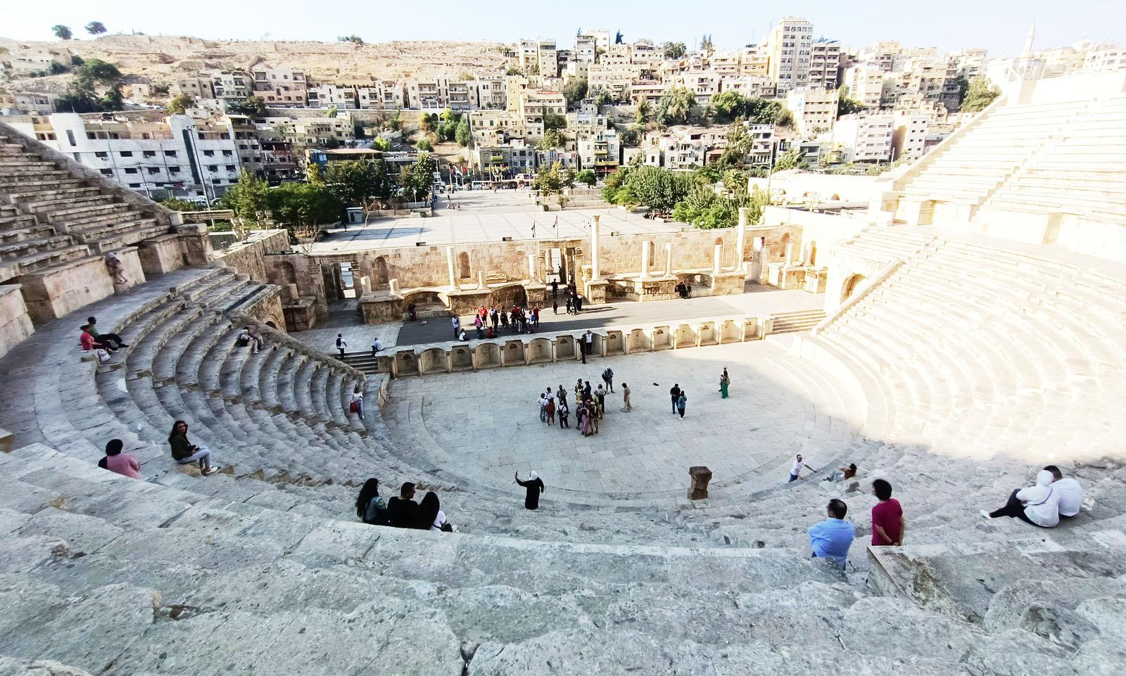 മ്യൂസിയത്തിൽനിന്ന് ഇറങ്ങി തിയറ്ററിന്റെ അരങ്ങിലെത്തി. ഇവിടെ നിൽക്കുമ്പോൾ വല്ലാത്തൊരു അനുഭൂതിയാണ്. എന്തെല്ലാം പരിപാടികൾക്കും ചടങ്ങുകൾക്കും ഈ അരങ്ങ് സാക്ഷിയായിട്ടുണ്ടാകുമെന്ന് ഞാൻ ആലോചിച്ചു. അവയുടെ പ്രതിധ്വനികൾ മുന്നിലെ ഇരിപ്പിടങ്ങളിൽ ഇപ്പോഴും പ്രതിഫലിക്കുന്നതുപോലെ. ഒരു കുന്നിൻ ചെരുവിലാണ് ഈ തിയറ്റർ പണിതിരിക്കുന്നത്. എ.ഡി 138-161 കാലഘട്ടത്തിൽ അേന്റാണിയസ് പയസ് ചക്രവർത്തിയുടെ ബഹുമാനാർത്ഥമാണ് ഈ ആംഫി തിയറ്റർ നിർമിച്ചതെന്ന് ഒരു സ്തംഭത്തിലെ ഗ്രീക്ക് ലിഖിതത്തിൽ സൂചിപ്പിക്കുന്നുണ്ട്. കാഴ്ചക്കാരിൽനിന്ന് സൂര്യനെ തടയാൻ വടക്കോട്ട് തിരിഞ്ഞായിരുന്നു ഇതിന്റെ നിർമാണം. ഇന്നും ഈ തിയറ്റർ അമ്മാൻകാർ ഉപയോഗിക്കുന്നുണ്ട്. അമ്മാൻ മാരത്തൺ സമ്മാനദാന ചടങ്ങ്, സംഗീത കച്ചേരികൾ, പ്രത്യേകിച്ച് അൽ-ബലാദ് മ്യൂസിക് ഫെസ്റ്റിവൽ എന്നിവയുൾപ്പെടെയുള്ള സാംസ്കാരിക മേളകളുടെ വേദിയാണിത്. 2019 ആഗസ്റ്റിൽ അമേരിക്കൻ റാപ്പർ റസ് ഇവിടെ സംഗീതനിശ അവതരിപ്പിച്ചിരുന്നു.