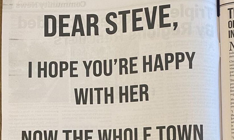 'പ്രിയപ്പെട്ട സ്റ്റീവ്, നീ അവളോടൊപ്പം സന്തോഷമായിരിക്കുമെന്ന് കരുതുന്നു. നീ എന്തൊരു വൃത്തികെട്ട വഞ്ചകനാണെന്ന് ഇപ്പോൾ എല്ലാവരും അറിയട്ടെ : എന്ന് ജെന്നി' -വെണ്ടക്ക അക്ഷരത്തിൽ ഇത്രയുമായിരുന്നു ഒരു മുഴു പേജിൽ അച്ചടിച്ചു വന്നത്. നിന്റെ ക്രഡിറ്റ് കാർഡുപയോഗിച്ചാണ് ഞാനീ പരസ്യത്തിന്റെ ബില്ല് കൊടുക്കുന്നത് എന്നു കൂടി പരസ്യത്തിലുണ്ടായിരുന്നു.