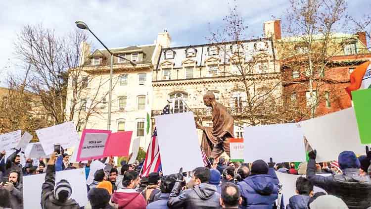 വാഷിങ്ടൺ: പൗരത്വ ഭേദഗതി നിയമത്തിനെതിരെ വാഷിങ്ടണിലെ ഇന്ത്യൻ എംബസിക്ക് മുന്നിലുള്ള ഗാന്ധി പ്രതിമക്ക് സമീപം ഇന്ത്യൻ വംശജരുടെ പ്രതിഷേധം. ഇന്ത്യയിലെ പൗരാവകാശങ്ങളും മതസ്വാതന്ത്ര്യവും സംരക്ഷിക്കുന്നതിനാണ് ഒത്തുകൂടലെന്ന് ചടങ്ങിൽ സംസാരിച്ച സെൻറർ ഫോർ പ്ലൂരലിസത്തിലെ മൈക് ഗൗസ് പറഞ്ഞു.