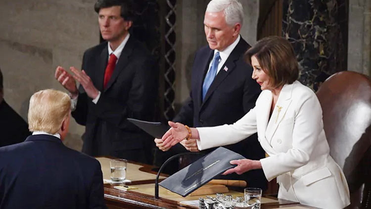 മൂന്നാമത് സ്റ്റേറ്റ് യൂണി യൻ പ്രസംഗത്തിന് മുമ്പ് യു.എസ് പ്രതിനിധി സഭ സ്പീക്കർ നാൻസി പെലോസിയെ പ്രസിഡൻറ് പരസ്യമായി അവഹേളിക്കുകയായിര ുന്നു. ട്രംപിനെതിരായ ഇംപീച്ച്മെൻറ് നടപടിക്ക് അനുമതി നൽകിയത് ഡെമോക്രാറ്റ് പാർട്ടി നേതാവായ നാൻസി പെലോസിയായിരുന്നു.